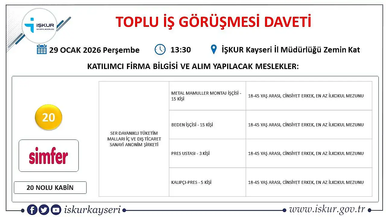 Kayseri’de iş arayanları sevindiren haber geldi. İşveren ile iş arayanı buluşturan Çalışma ve İş Kurumu İl Müdürlüğü (İŞKUR) yeni yılın ilk fırsatını yayımladı. İŞKUR’dan yapılan paylaşımda, kentte farklı alanlarda faaliyet gösteren firmaların yüzlerce kişilik alım yapacağı duyuruldu. Buna göre, kentteki 24 firma 492 kişilik alım gerçekleştirecek.