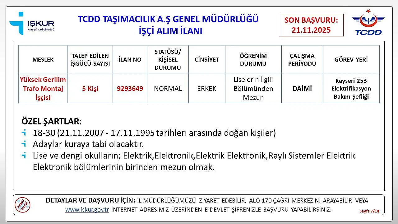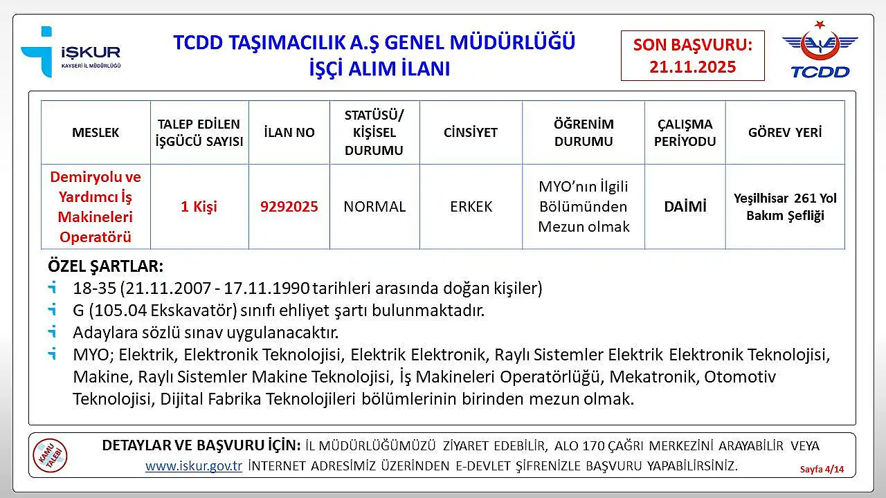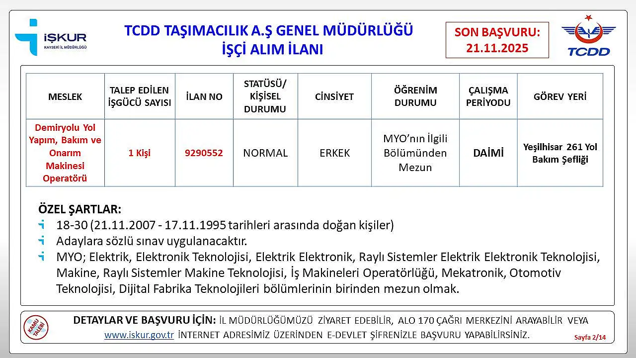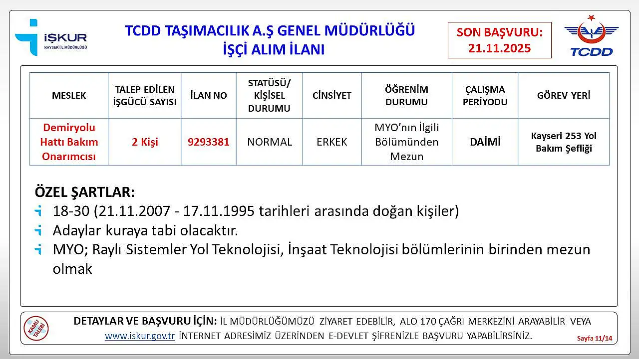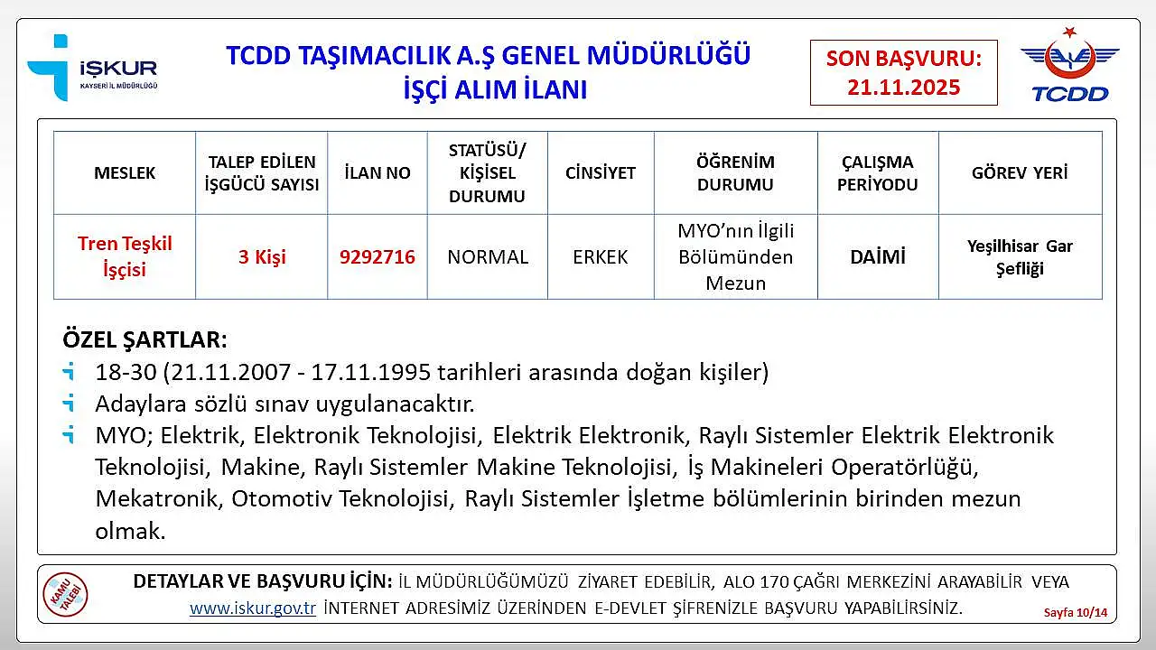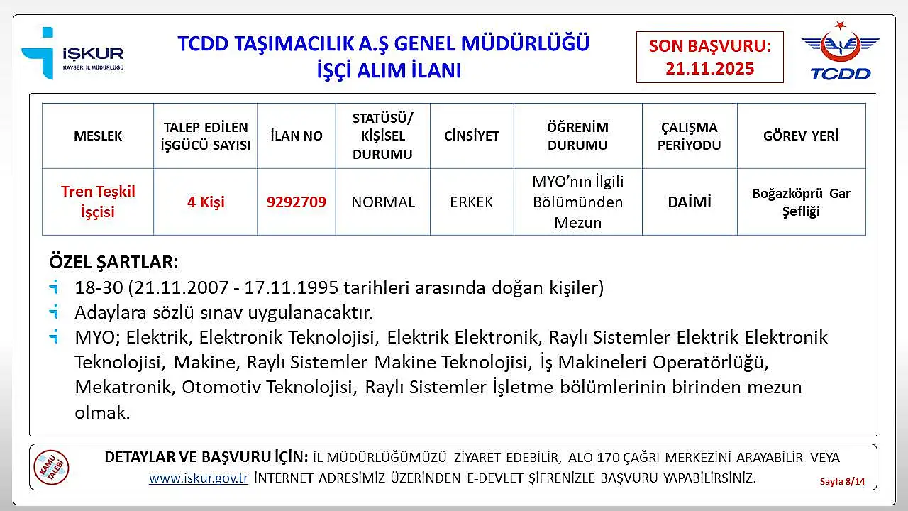 Kayseri’de iş arayanlar için müjdeli bir haber geldi. Türkiye Cumhuriyeti Devlet Demiryolları (TCDD), Kayseri’de istihdam edilmek üzere daimi işçi alımı yapacağını duyurdu.