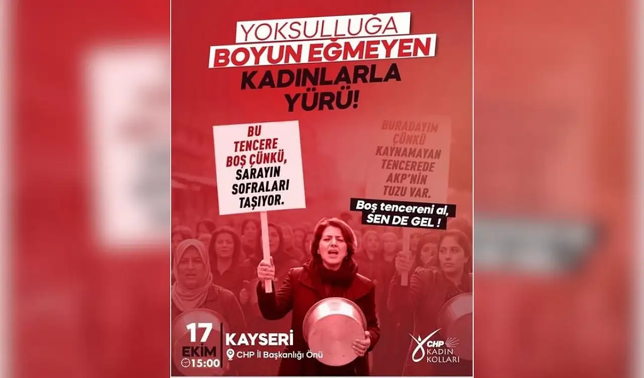 CHP Kadın Kolları Başkanlığı tarafından yapılan bilgilendirmede kadınların boş tencere ile eyleme katılabilecekleri vurgulanırken, “Boş tencereni al sen de gel” diyerek çağırıldı. Paylaşılan afişte, “Bu tencere boş çünkü sarayın sofraları taşıyor”, “Buradayım çünkü kaynamayan tencerede AKP’nin tuzu var” ifadelerine yer verildi.