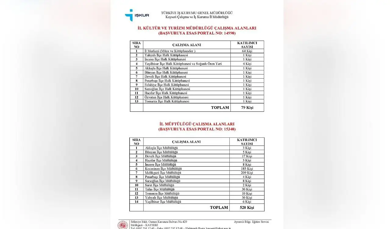 Kayseri’de iş arayanlar için müjdeli haber geldi. Kentteki kamu kurumlarının bazıları alım yapacak. işveren ile iş arayanı buluşturan Çalışma ve İş Kurumu İl Müdürlüğü (İŞKUR) tarafından alım yapılacak bölümler ve istenen şartlar paylaşıldı. Buna göre, İşgücü Uyum Programı (İUP) kapsamında temizlik, bakım ve onarım faaliyetlerinin desteklenmesi amacıyla İl Kültür ve Turizm Müdürlüğü bünyesinde 79, İl Müftülüğü bünyesinde ise 520 katılımcılı olmak üzere 599 kişilik alım yapılacak.