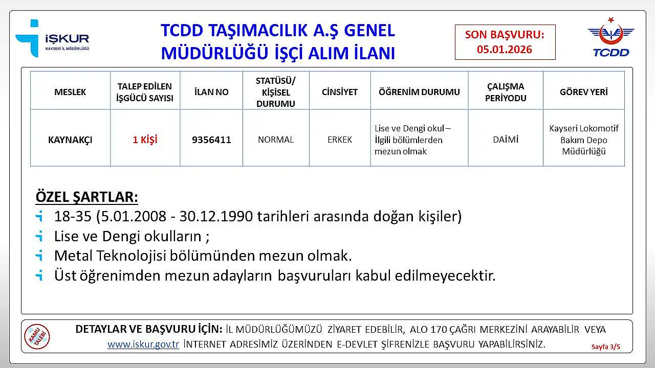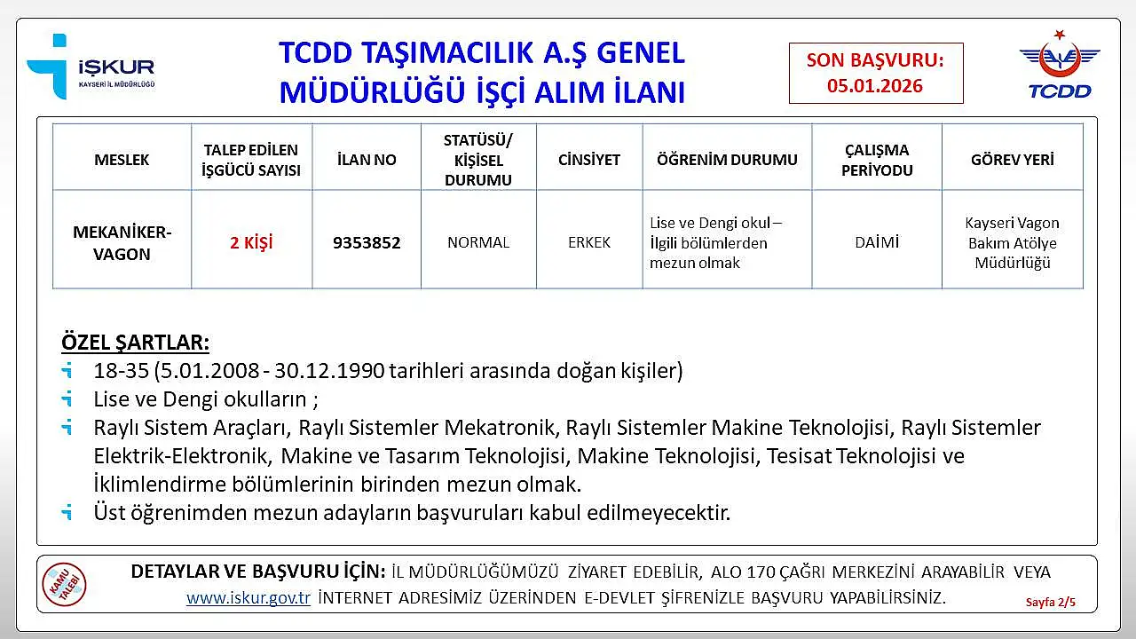 2 mekaniker-vagon, 1 kaynakçı olmak üzere toplam 3 kişi alınacak. İş için başvurular 5 Ocak Pazartesi günü sona erecek. Başvurular, İŞKUR İl Müdürlüğü, internet sitesi, e-devlet sistemi ve Alo 170 çağrı merkezinden yapılabilecek.