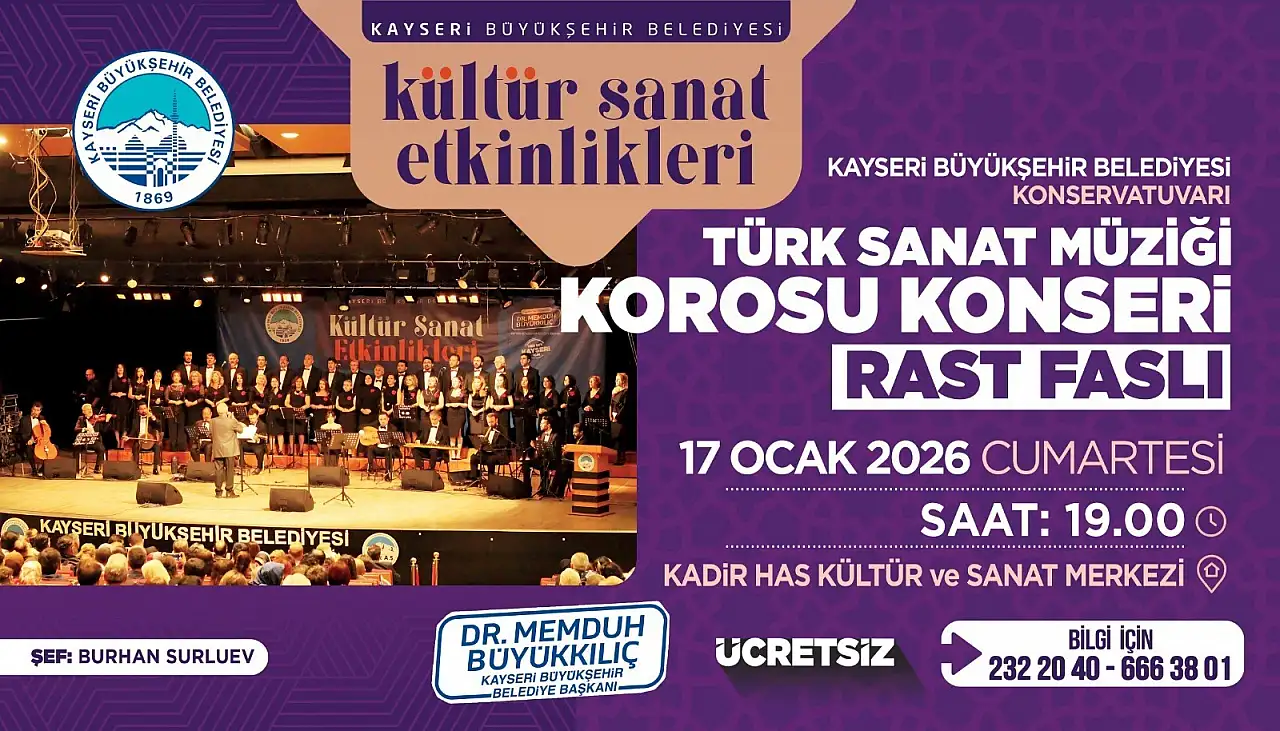 Kayseri Büyükşehir Belediye Başkanı Memduh Büyükkılıç’ın kültür ve sanata verdiği önem doğrultusunda çalışmalarını sürdüren Büyükşehir Belediyesi, Konservatuvar bünyesinde gerçekleştirdiği konserler ve sanatsal etkinliklerle, Kayseri’yi kültür ve sanatın merkezi haline getirme hedefini kararlılıkla sürdürüyor. Bu kapsamda Büyükşehir Belediyesi Konservatuvarı Türk Sanat Müziği Korosu tarafından hazırlanan Rast Faslı Konseri, Türk Musikisi’nin zarafetini ve geleneksel fasıl anlayışını Kayserililerle buluşturacak.