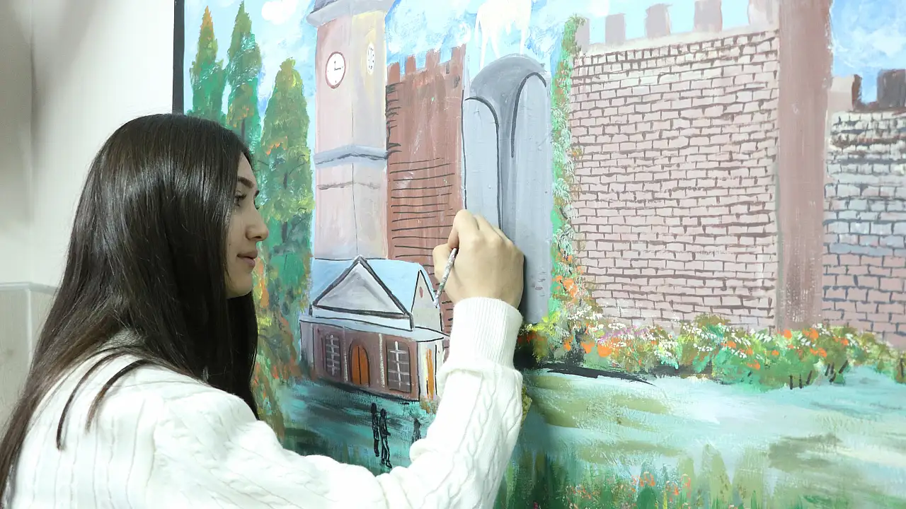 Kayseri'de Celal Bayar Kız Mesleki ve Teknik Anadolu Lisesi öğrencileri, okulun boş duvarlarına Mimar Sinan ve eserleri ve kentin tarihi yerlerini resmetti.