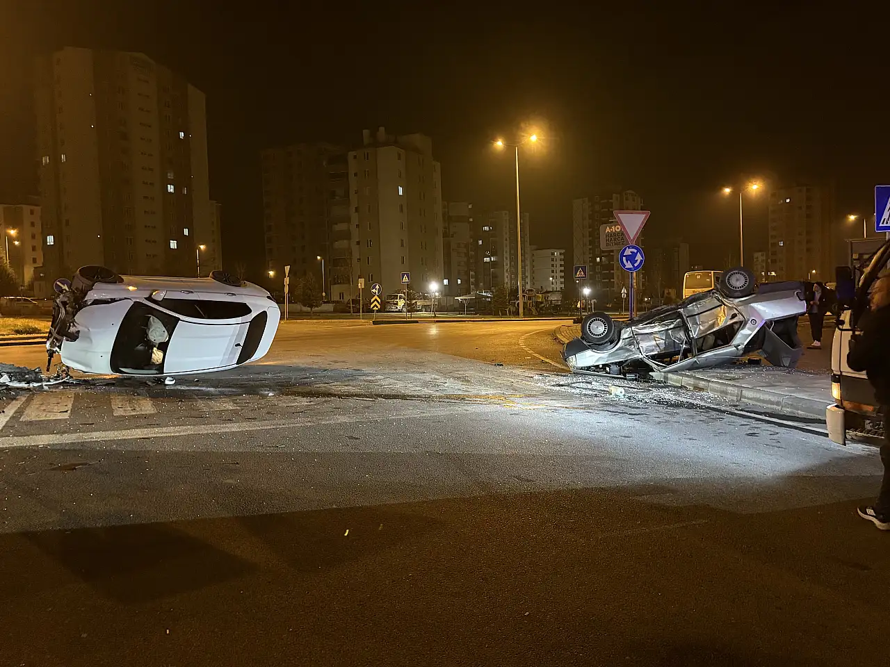 Kayseri'de kavşakta meydana gelen trafik kazasında, otomobillerden biri yan yatarken, diğeri de takla attı.