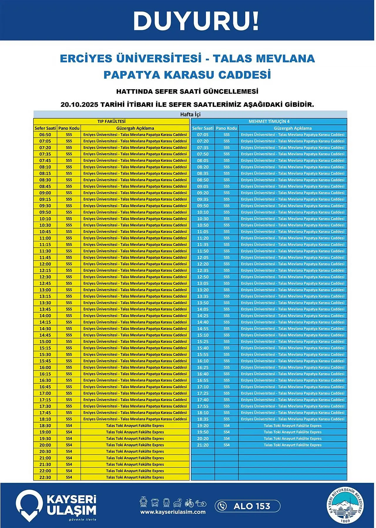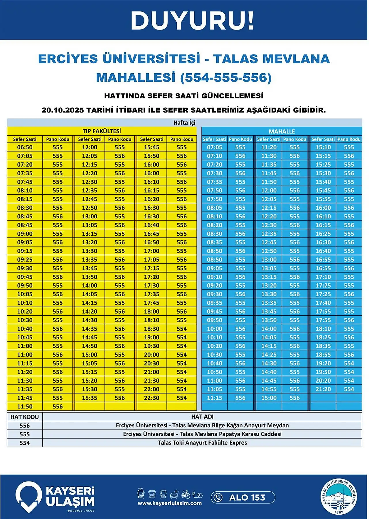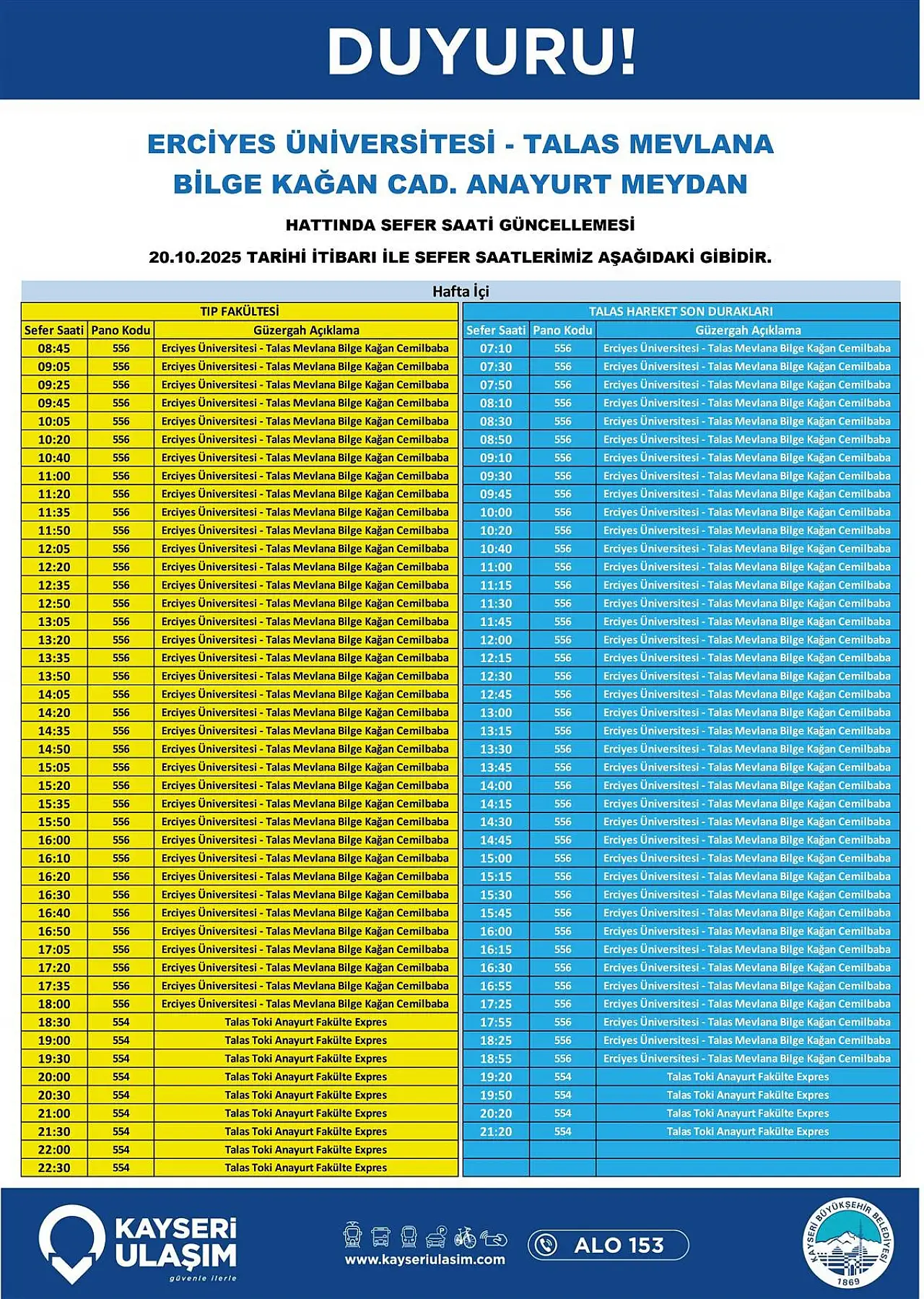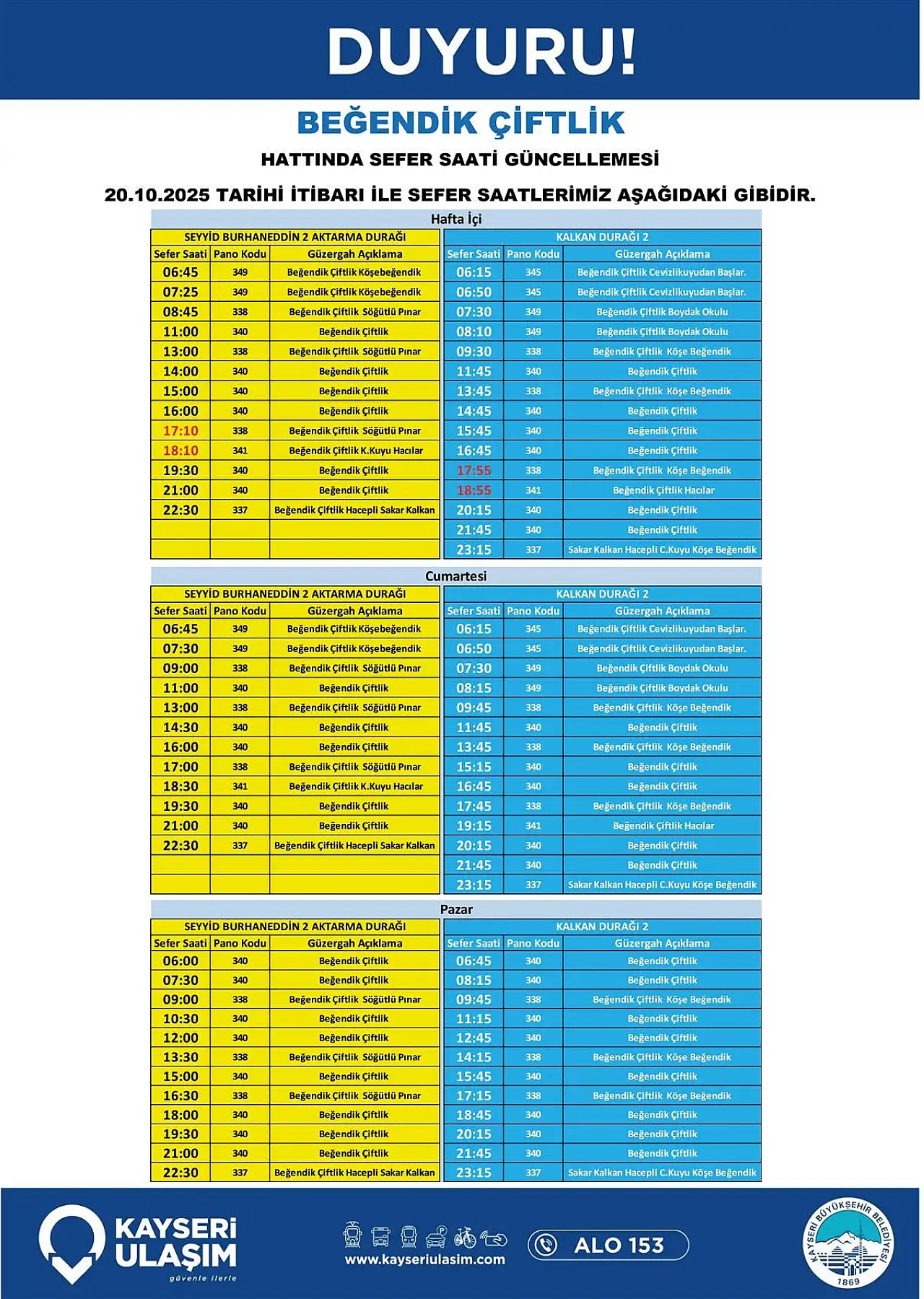 Kayseri Ulaşım A.Ş., şehir içi toplu taşımada yolcu memnuniyetini artırmak ve hizmet verimliliğini yükseltmek amacıyla otobüs hatlarında düzenlemelere devam ediyor. Yolcu yoğunluğu, saat bazlı talepler ve güzergâh geri bildirimleri dikkate alınarak yapılan çalışmalar sonucunda, 12 otobüs hattının güzergahı ve sefer saatleri güncellendi.