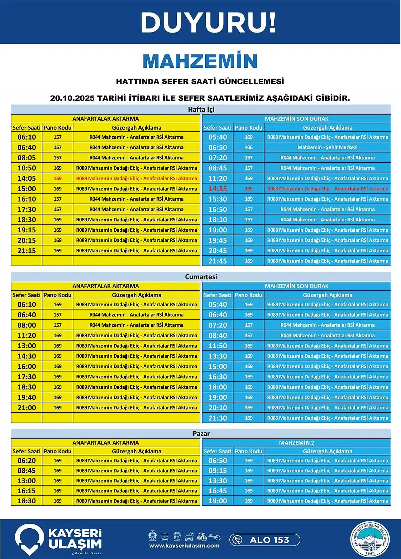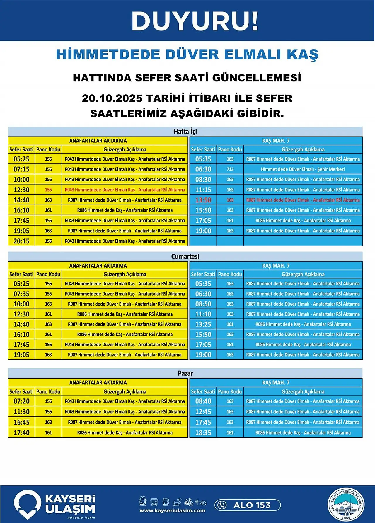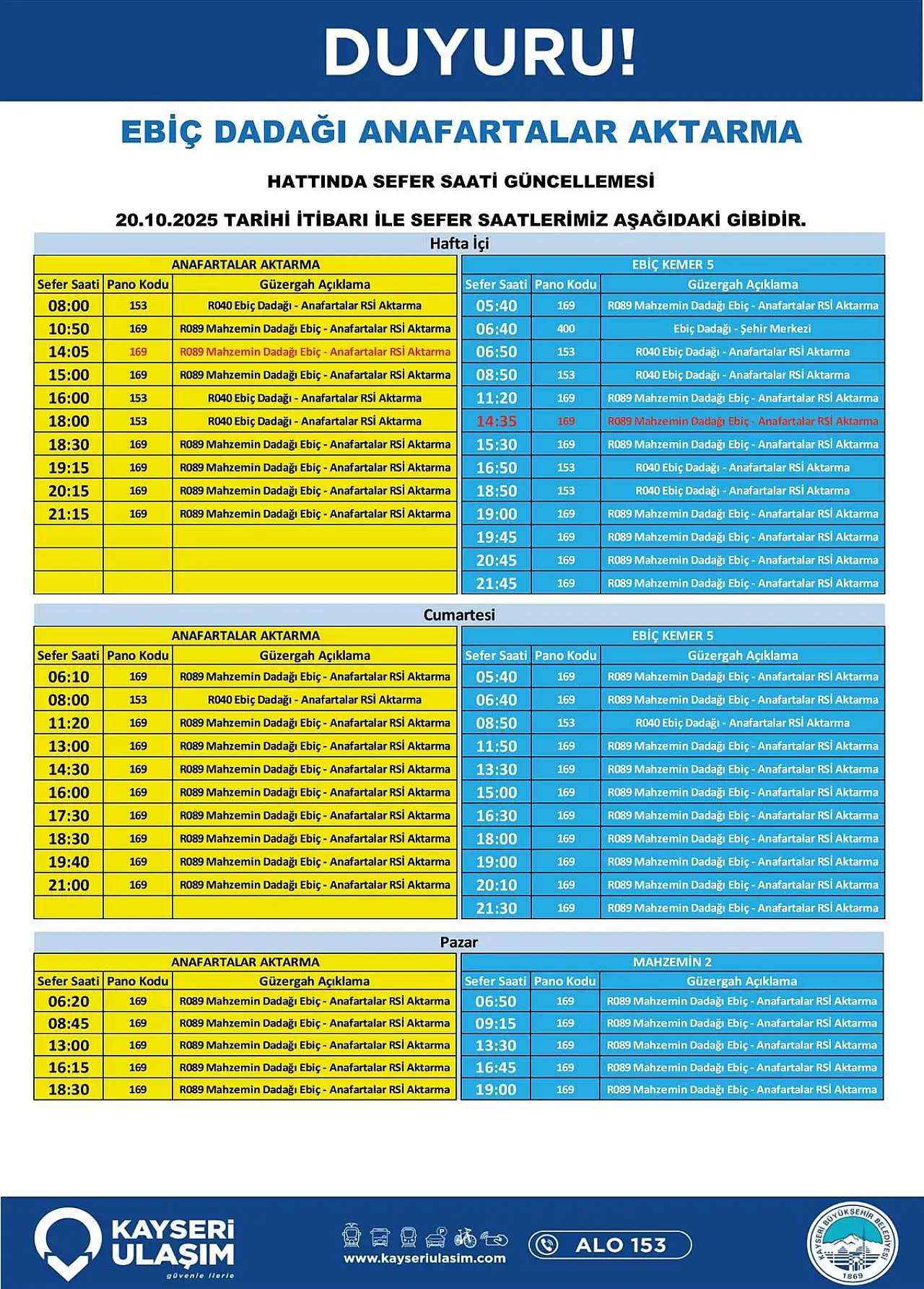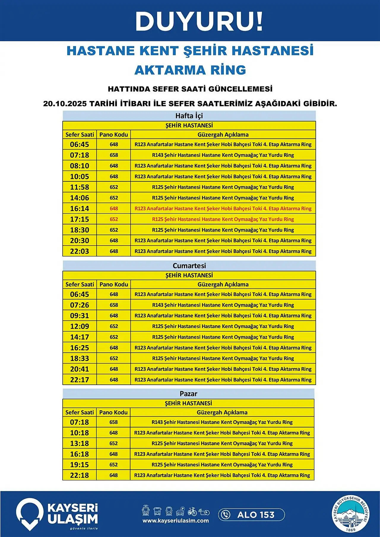 Kayseri Ulaşım A.Ş., şehir içi toplu taşımada yolcu memnuniyetini artırmak ve hizmet verimliliğini yükseltmek amacıyla otobüs hatlarında düzenlemelere devam ediyor. Yolcu yoğunluğu, saat bazlı talepler ve güzergâh geri bildirimleri dikkate alınarak yapılan çalışmalar sonucunda, 12 otobüs hattının güzergahı ve sefer saatleri güncellendi.