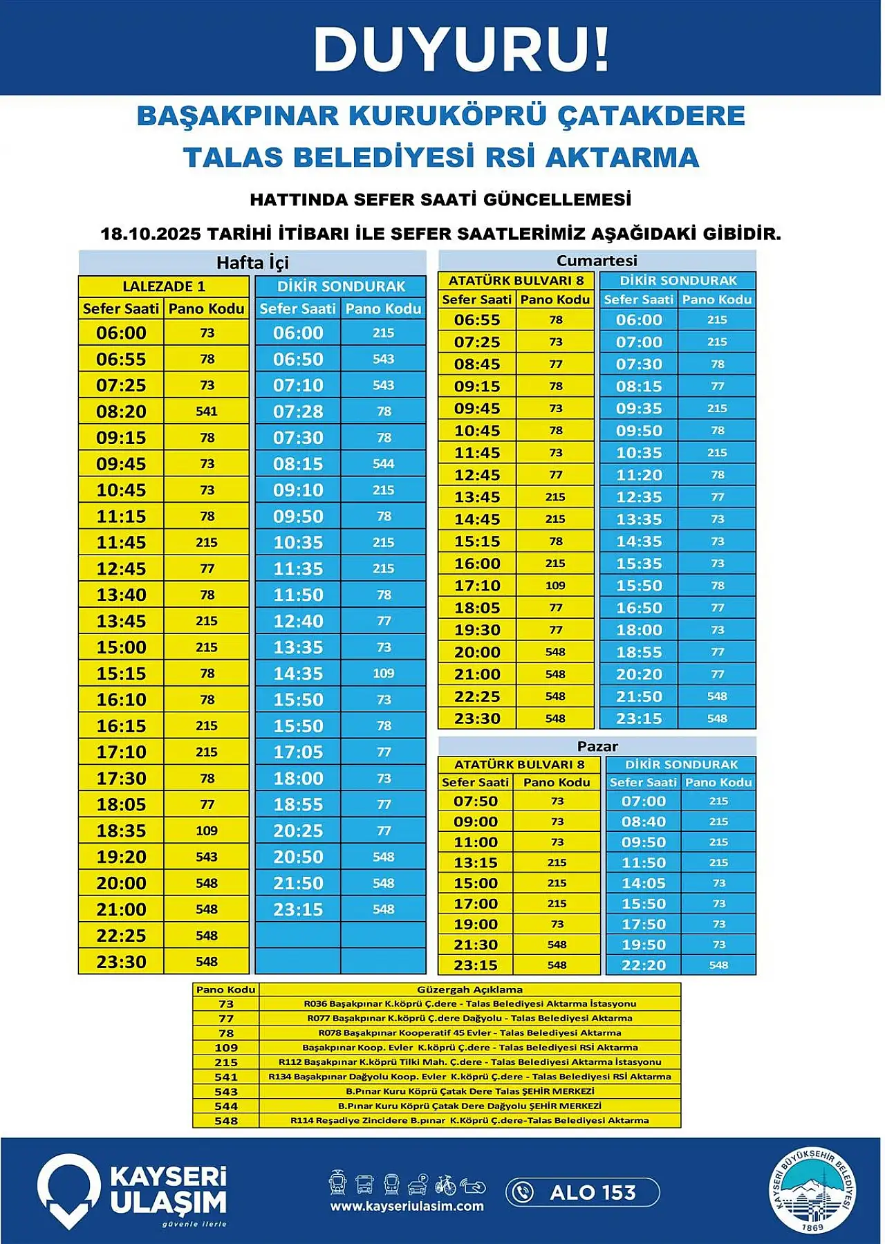 Başakpınar Kuruköprü Çatakdere Talas Belediyesi Rsi Aktarma Hattında Sefer Saati Güncellemesi