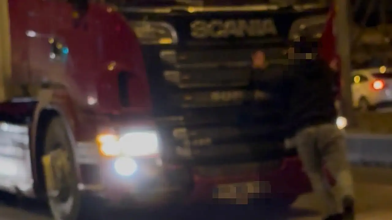 Kayseri'nin Kocasinan ilçesinde trafik durma noktasına geldi. Vatandaşlar nedenini merak ederken alkollü şahsın tırın geçmesine izin vermediği belli oldu.