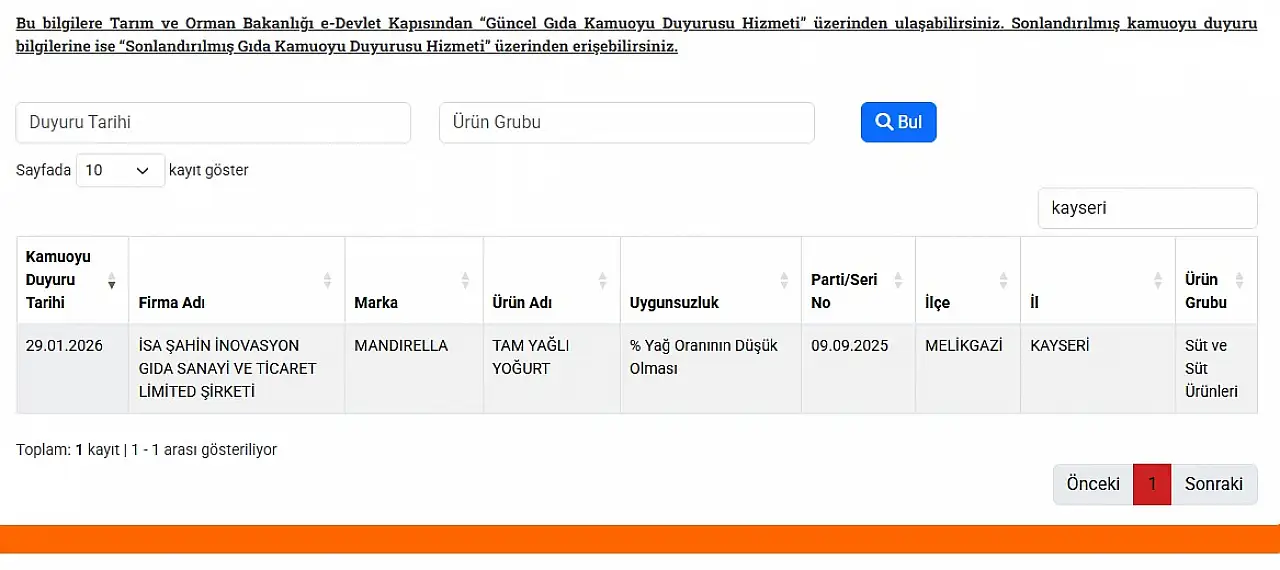 Bakanlık tarafından hayata geçirilen uygulamada ülkenin dört bir yanında Taklit ve Tağşiş yapan firmalar vatandaşlara duyuruluyor. Geçtiğimiz aylarda yapılan bu duyurularda sık sık Kayseri’den firmalar bulunurken, sucuk, peynir, baharatlarda hile yapıldığı da belirlenmişti. Bu kez ise Kayseri’nin Melikgazi ilçesinde bulunan bir firmada yoğurtta yağ oranının düşük olduğu tespit edildi.