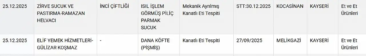 Tarım ve Orman Bakanlığı yetkilileri tarafından vatandaşların güvenli gıdaya ulaşması ve sağlıklı bir şekilde tüketmesi için Türkiye’nin dört bir yanında denetim gerçekleştiriliyor. Yapılan denetimlerin sonucunda hile yapan firmalar bakanlık tarafından kamuoyuna duyurulurken Taklit ve Tağşiş Listesi güncellendi. 25 Aralık 2025 itibari ile listeye Kayseri’den iki firma daha eklenirken, sucuk ve köftede hile yapıldığı tespit edildi.