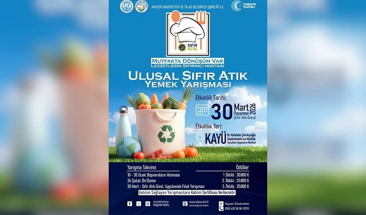 Kayseri'de gençler hünerlerini sergileyecek. Talas Belediyesi ile Kayseri Üniversitesi iş birliğinde Ulusal Sıfır Atık Yemek Yarışması düzenlenecek.