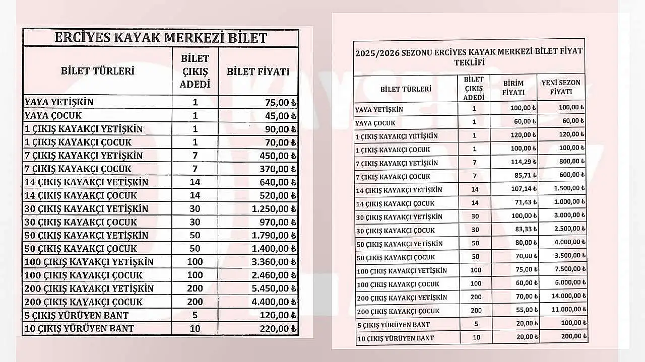 Kayseri Erciyes'te yeni sezon ücret tarifesi belli oldu. Yeni sezonla birlikte Erciyes'te de ücretler zamlanacak. Kayseri Büyükşehir Belediye Meclisi'nde Erciyes Kayak Merkezi 2025-2026 sezonu bilet fiyatları ve uygulama esaslarının belirlenmesi talebi hususunda hazırlanan Plan ve Bütçe Komisyon Raporu görüşüldü.