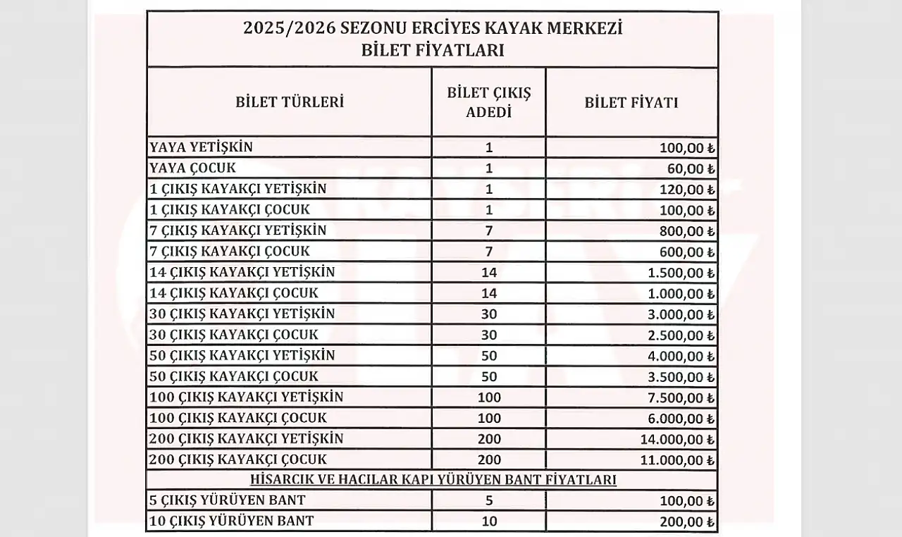 İşte Erciyes'te yeni sezonda uygulanacak ücret tarifesi