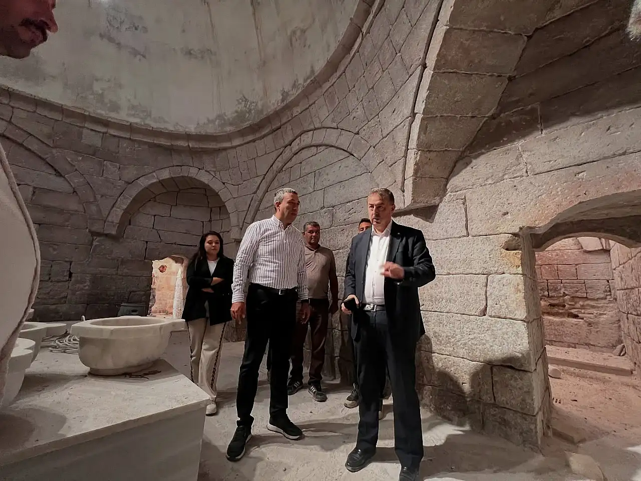 Başkan Taşyapan, ‘Tarihi hamam da restorasyon çalışmaları devam ediyor. Buranın restorasyonunu tamamlamak üzereyiz. Bu yıl içerisinde hizmete açılması yönünde planlamamız var. Ama bu tarihi alanı hamam olarak açmayacağız. Başka bir fonksiyon yükleyeceğiz. Belki Kitap kafe olarak açma gibi bir projemiz, düşüncemiz de var’ dedi.