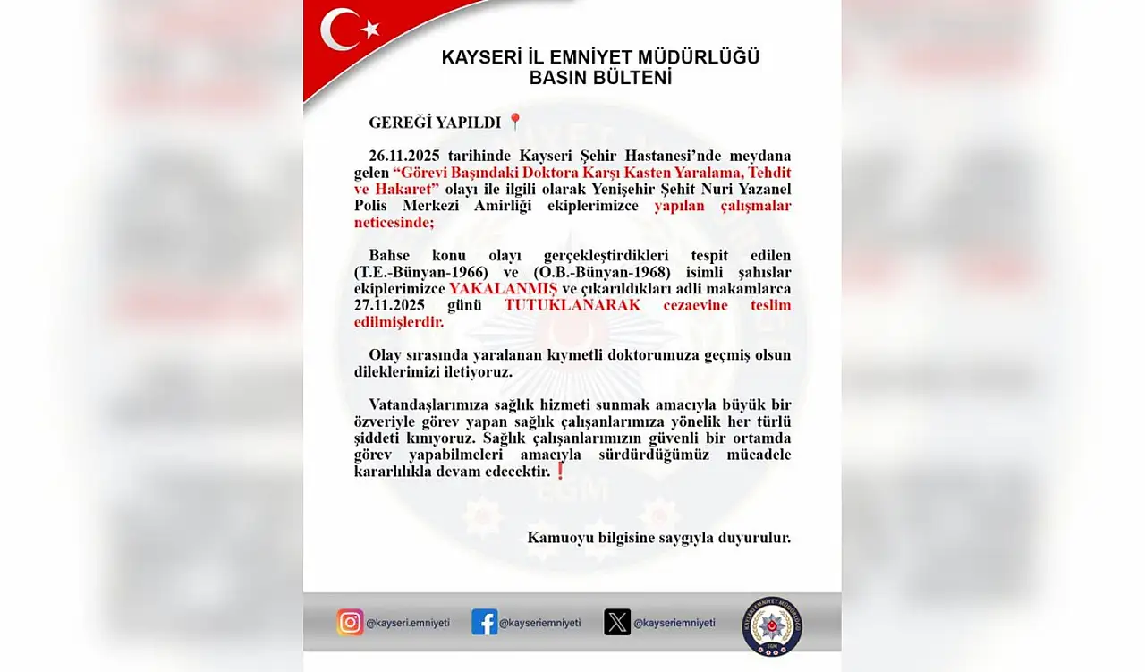 Edinilen bilgiye göre Kayseri Şehir Hastanesi’nde meydana gelen 'Görevi Başındaki Doktora Karşı Kasten Yaralama, Tehdit ve Hakaret' olayı ile ilgili olarak Yenişehir Şehit Nuri Yazanel Polis Merkezi Amirliği ekiplerince çalışma yapıldı. Çalışmalarda olayı gerçekleştirdikleri tespit edilen T.E. ve O.B. ekiplerce yakalandı. Emniyetteki işlemleri tamamlanan T.E. ve O.B.; çıkarıldıkları mahkemece tutuklanarak cezaevine teslim edildi.