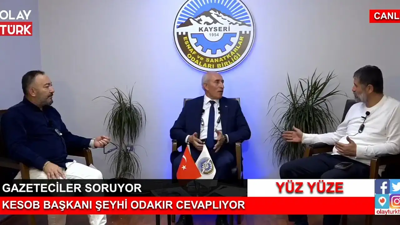 Kayseri Esnaf ve Sanatkarlar Odaları Birliği (KESOB) Başkanı Şeyhi Odakır, Olay Türk TV ekranlarında yayınlanan Yüz Yüz programına katıldı. Gündeme ilişkin açıklamalarda bulunan Başkan Odakır, Gazeteciler Osman Çiftci ile Cem Atakan'ın sorularını yanıtladı.
