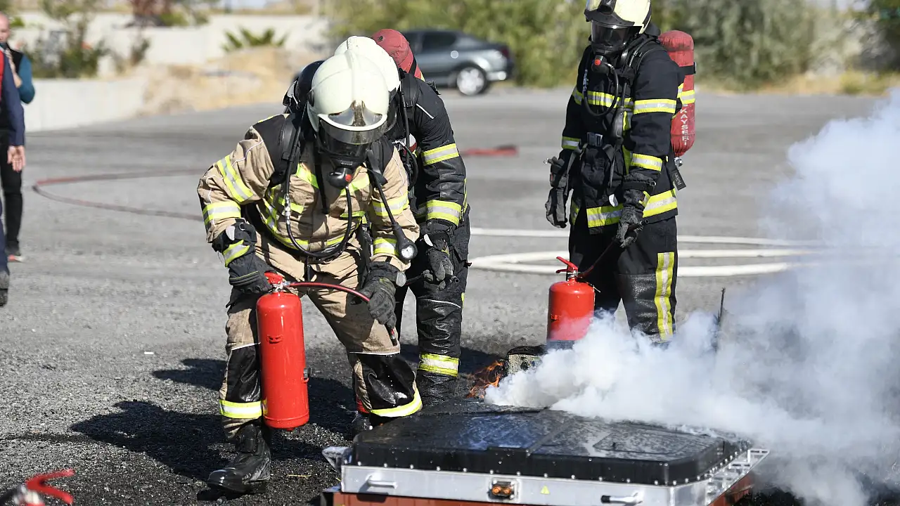Kayseri Büyükşehir Belediyesi lityum iyon batarya söndürme tatbikatı gerçekleştirdi.