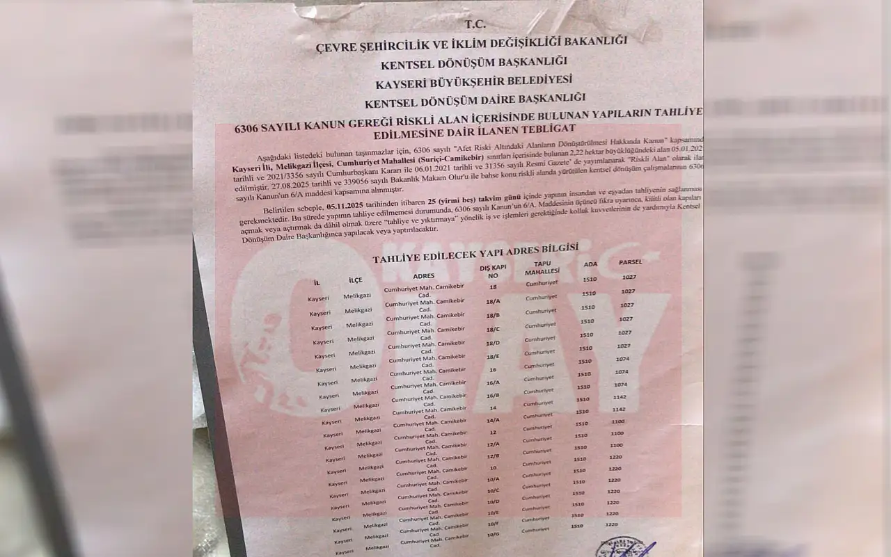 Cumhuriyet Mahallesi Camikebir Caddesi üzerinde faaliyet gösteren esnaflara gönderilen tebligatta şu ifadeleri yer aldı: Listede bulunan taşınmazlar için, 6306 sayılı ‘Afet Riski Altındaki Alanların Dönüştürülmesi Hakkında Kanun’ kapsamında Kayseri İli, Melikgazi İlçesi, Cumhuriyet Mahallesi (Suriçi-Camikebir) sınırları içerisinde bulunan 2,22 hektar büyüklüğündeki alan 05.01.202 tarihli ve 2021/3356 sayılı Cumhurbaşkanı Karanı ile 06.01.2021 tarihli ve 31356 sayılı Resmi Gazete' de yayımlanarak ‘Riskli Alan’ olarak ilan edilmiştir. 27.08.2025 tarihli ve 339056 sayılı Bakanlık Makam Olur'u ile bahse konu riskli alanda yürütülen kentsel dönüşüm çalışmalarının 6306 sayılı Kanun'un 6/A maddesi kapsamına alınmıştır. Belirtilen sebeple, 05.11.2025 tarihinden itibaren 25 (yirmi beş) takvim günü içinde yapının insandan ve eşyadan tahliyenin sağlanması gerekmektedir. Bu sürede yapının tahliye edilmemesi durumunda, 6306 sayılı Kanun'un 6/A. Maddesinin üçüncü fıkra uyarınca, kilitli olan kapıları açmak veya açtırmak da dahil olmak üzere ‘tahliye ve yıktırmaya’ yönelik iş ve işlemleri gerektiğinde kolluk kuvvetlerinin de yardımıyla Kentsel Dönüşüm Daire Başkanlığınca yapılacak veya yaptırılacaktır.
