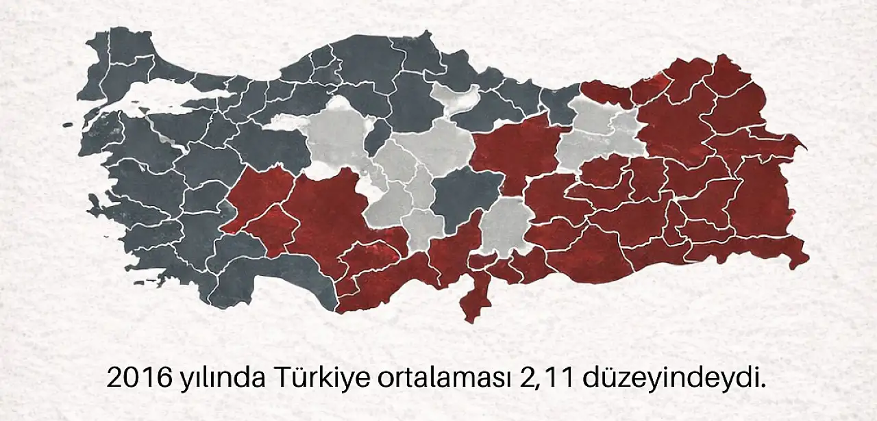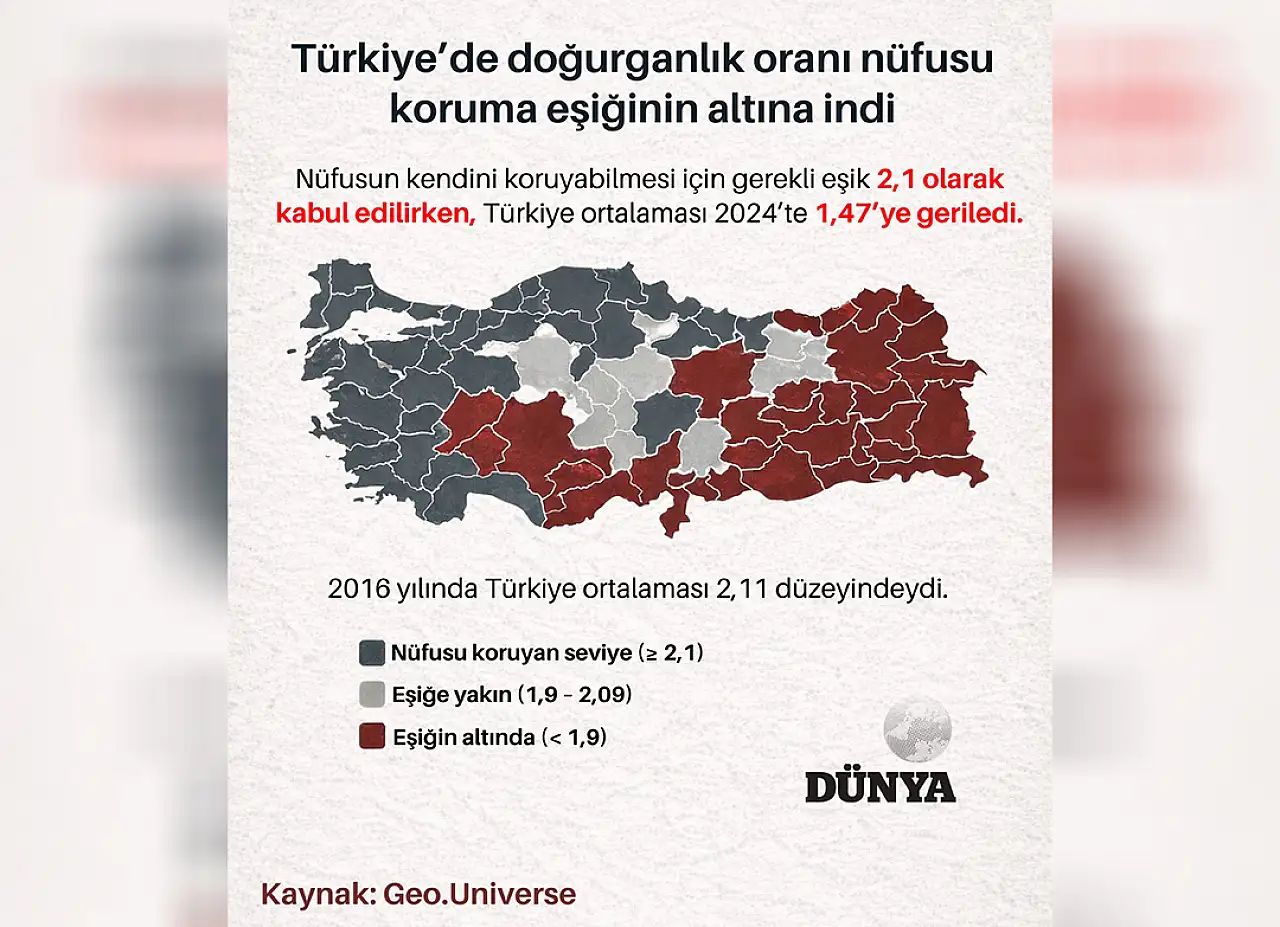 Diğer yandan nüfusun kendini koruyabilmesi için gerekli eşik 2,1 olarak kabul edilirken, Türkiye ortalaması 2024’te 1,47’ye kadar geriledi. Orta çıkan bu düşündürücü verilerin, doğurganlık oranının ülke genelinde nüfusu koruma eşiğinin altına indiğini gösteriyor. 2016 yılında Türkiye ortalaması 2,11 düzeyindeydi.