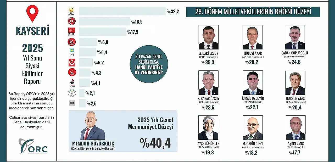Öte yandan ORC’nin geçtiğimiz günlerde yaptığı ‘İl Milletvekillerinin 2025 yılı Beğeni Düzeyi’ araştırma sonucunda ilk sırada Milliyetçi Hareket Partisi (MHP) Kayseri Milletvekili Baki Ersoy, ikinci sırada AK Parti Milletvekili Hulusi Akar ve üçüncü sırada ise bir diğer AK Partili vekil Şaban Çopuroğlu yer almıştı.