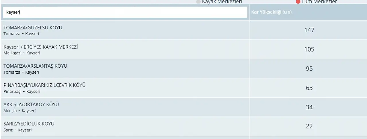 Meteoroloji Genel Müdürlüğü tarafından Kayseri’de kar kalınlığı en yüksek bölgeler belirlendi. Resmi sitesinde yer alan bilgilerde Erciyes Kayak Merkezi’nde kar kalınlığı 105 santimetre olarak ölçülürken Tomarza’nın Güzelsu Mahallesi ise fark attı. 147 santimetreye ulaşan kar kar kalınlığı ile Güzelsu Mahallesi’nin ardından 95 santimetre ile Tomarza’nın Arslantaş Mahallesi ve 63 santimetre ile Pınarbaşı’nın Yukarıkızılçevrik Mahallesi yer aldı.