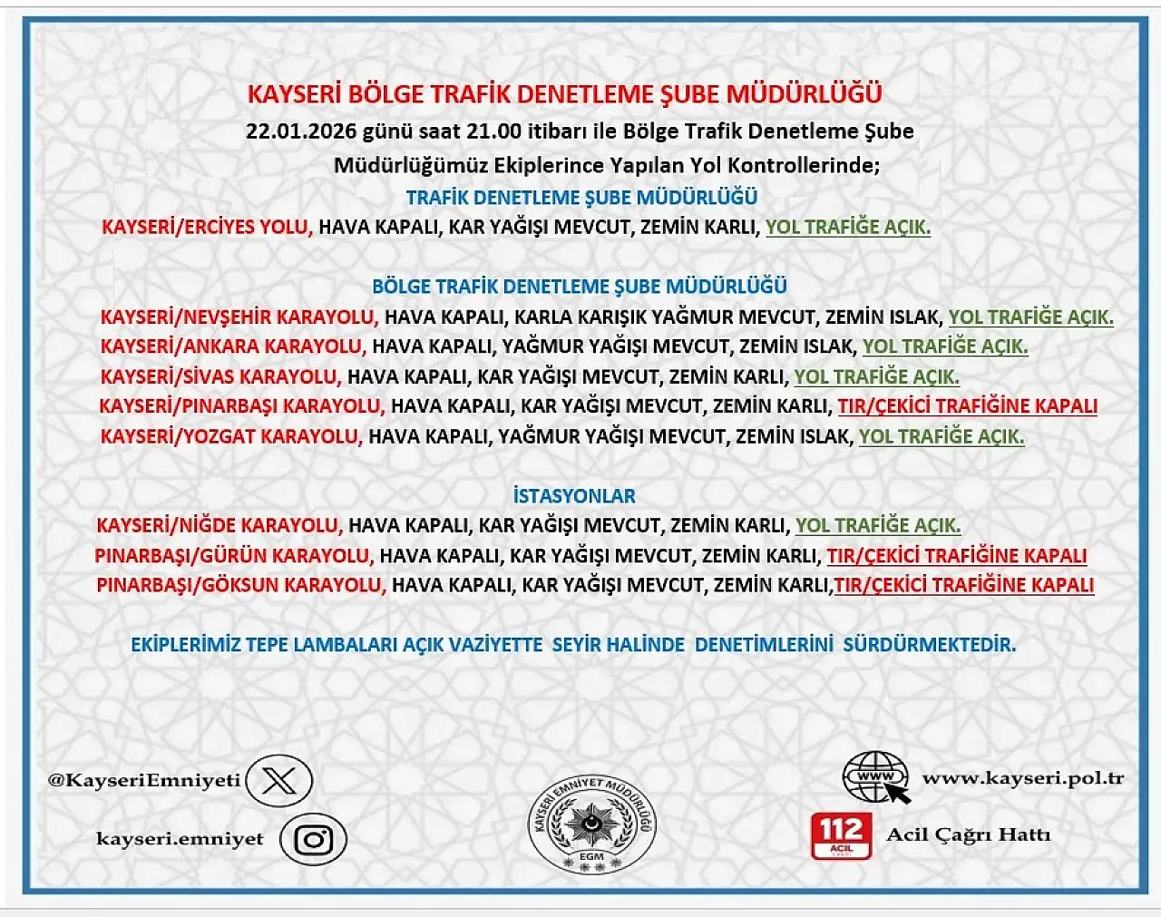 Kayseri Bölge Trafik Denetleme Şube Müdürlüğü, saat 21.00 itibarıyla şehirlerarası yollardaki son durumu paylaştı. Yoğun kar yağışı ve buzlanma nedeniyle Pınarbaşı güzergahında ulaşım durma noktasına geldi.