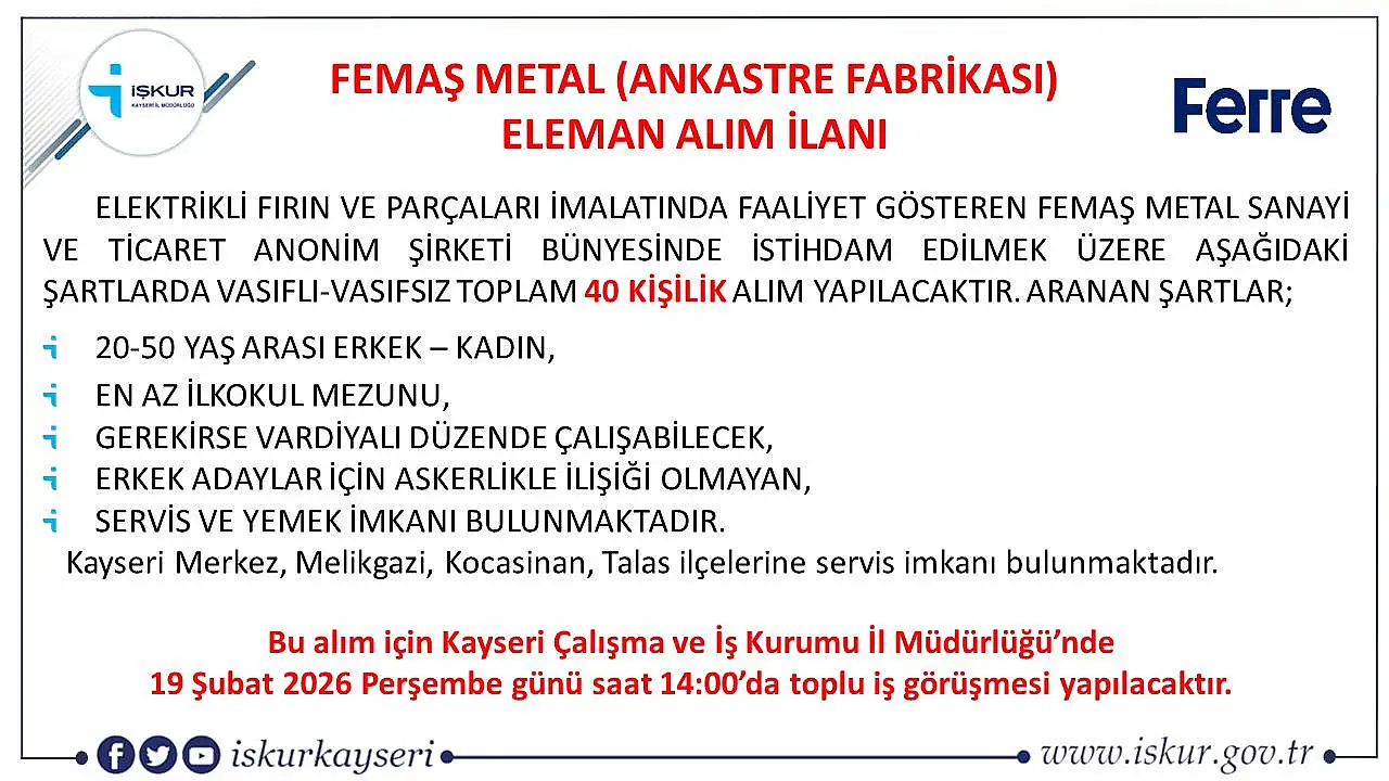 Kayseri'de iş arayanları sevindiren haber geldi. Kayseri Organize Sanayi Bölgesi'nde faaliyet gösteren Femaş Metal Sanayi ve Ticaret A.Ş. bünyesinde görevlendirmek üzere personel alımı yapacak. Detaylar Kayseri Olay haber merkezince derlediğimiz haberimizde.