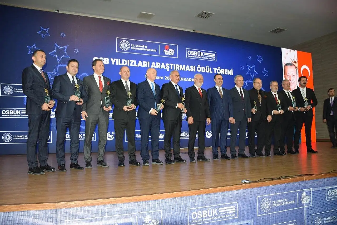 Organize Sanayi Bölgeleri Üst Kuruluşu (OSBÜK) tarafından bu yıl beşincisi düzenlenen, 2025 OSB Yıldızları Araştırması ödül töreni Ankara’da düzenlendi. Kayseri OSB Başkanı Mehmet Yalçın, Yönetim Kurulu Üyesi Kamil Çeken ve Denetim Kurulu Üyesi Mustafa Gengeç, Sanayi ve Teknoloji Bakanı Mehmet Fatih Kacır, AK Parti Genel Başkan Vekili Mustafa Elitaş, OSBÜK Başkanı Memiş Kütükcü ve davetlilerin yer aldığı törene katıldı.