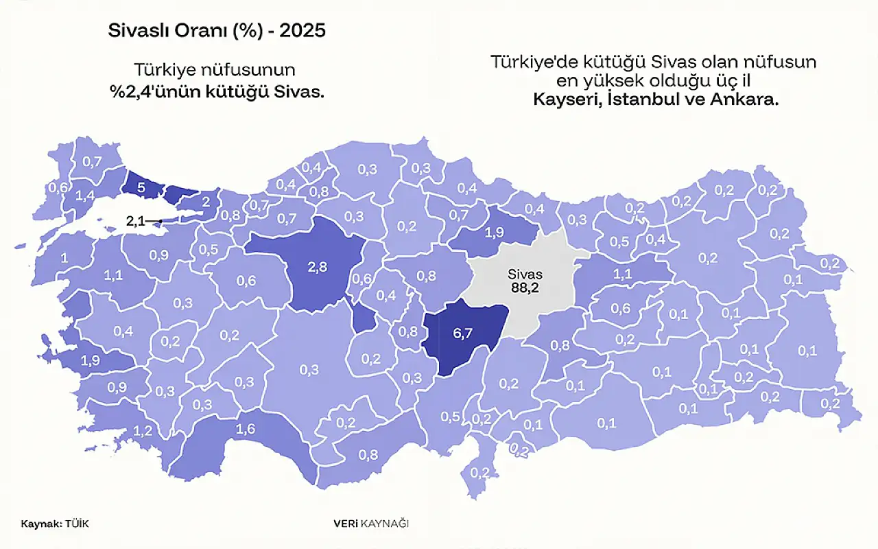 Türkiye nüfusunun yüzde 2,4’ünün kütüğü de Sivas. Türkiye İstatistik Kurumu’nun (TÜİK) 2025 yılına ilişkin Adrese Dayalı Nüfus Kayıt Sisteminde (ADNKS ) yer alan ‘İkamet edilen ile göre nüfus kütüğüne kayıtlı olunan il’ verilerine göre Kayseri’de 96 bin 441 Sivaslı yaşıyor. Kayseri nüfusunun yüzde 6,7’sinin kütüğü Sivas’ta.