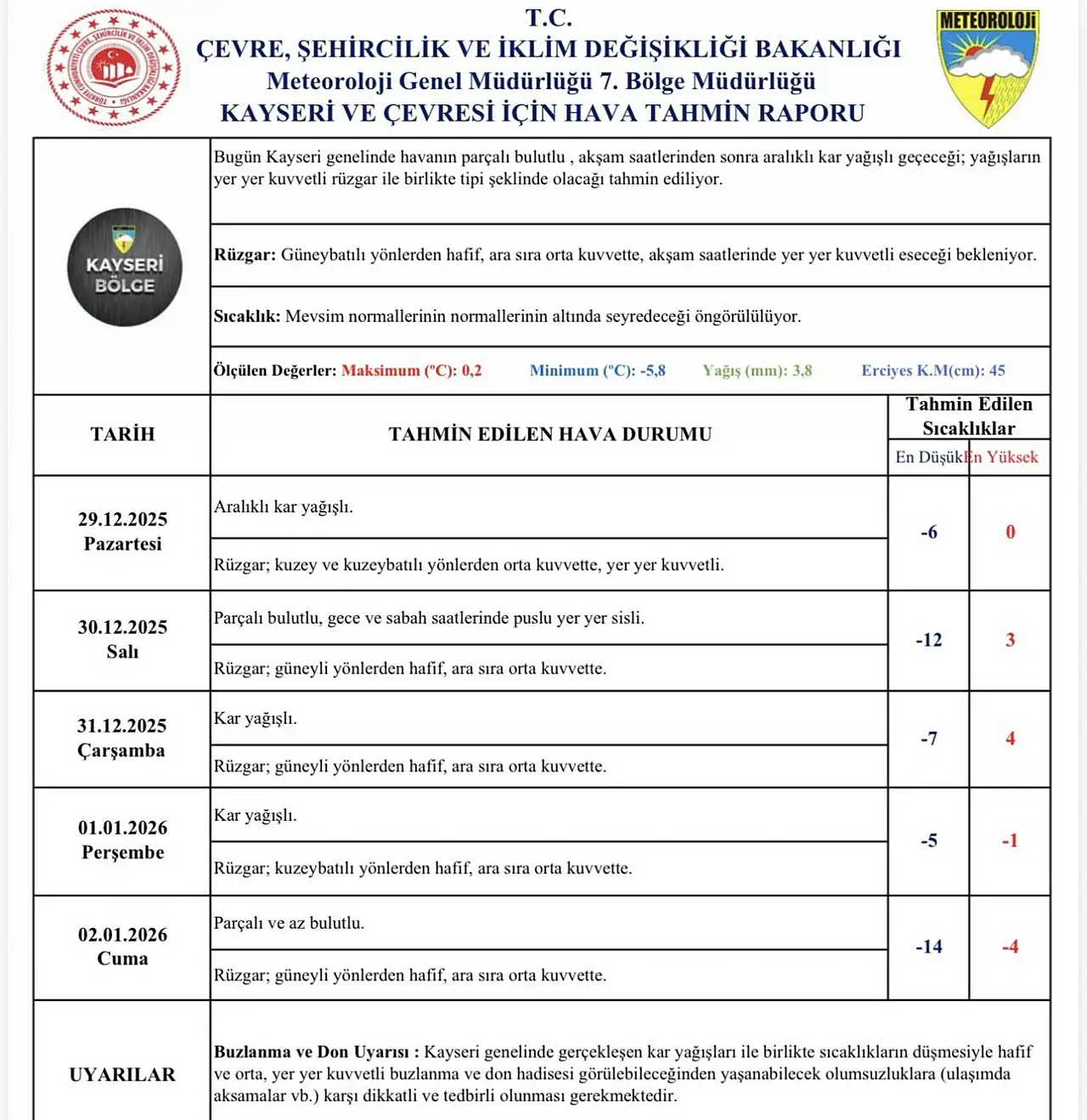 Öte yandan etkili olacak yağışların ardından oluşabilecek aksiliklere karşı meteoroloji uyarılarda bulundu. Uyarıda, “Kayseri genelinde gerçekleşen kar yağışlarıyla birlikte sıcaklıkların düşmesiyle hafif ve orta, yer yer kuvvetli buzlanma ve don hadisesi görülebileceğinden yaşanılabilecek olumsuzluklara karşı (ulaşımda aksamalar vb.) karşı dikkatli ve tedbirli olunması gerekmektedir.” denildi.