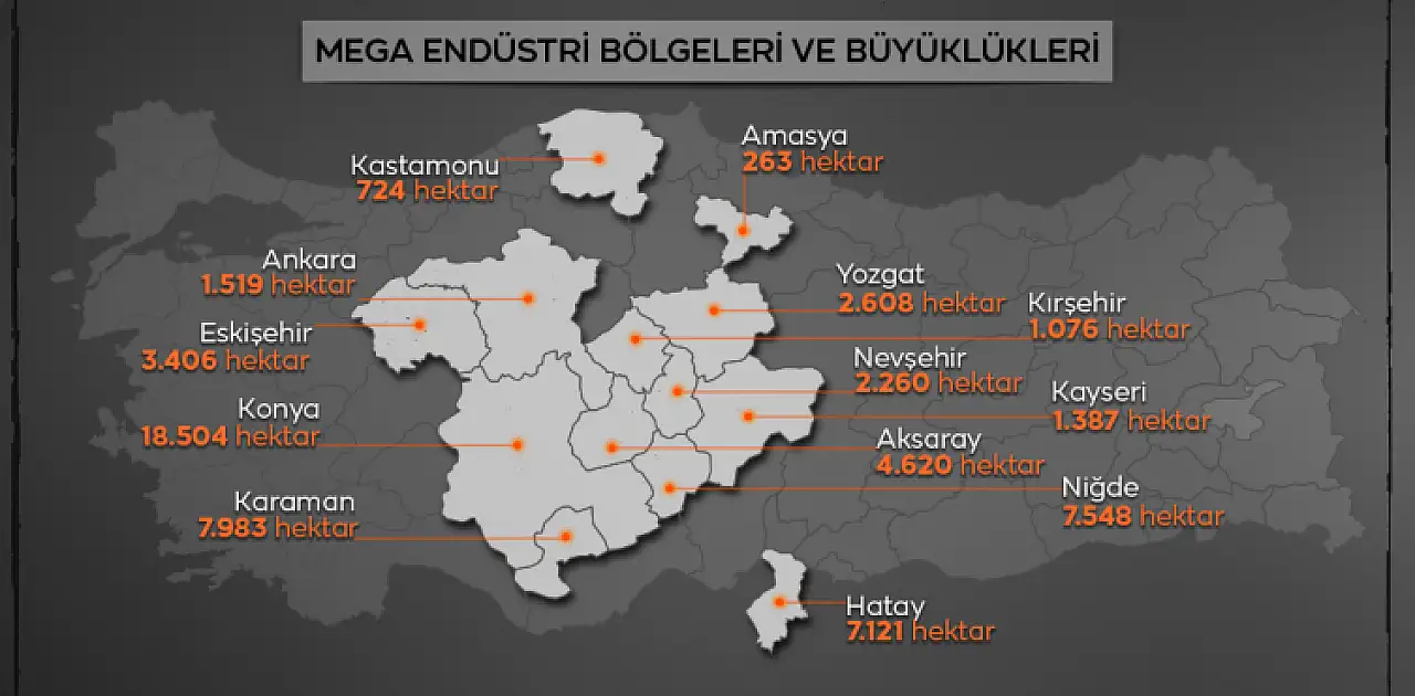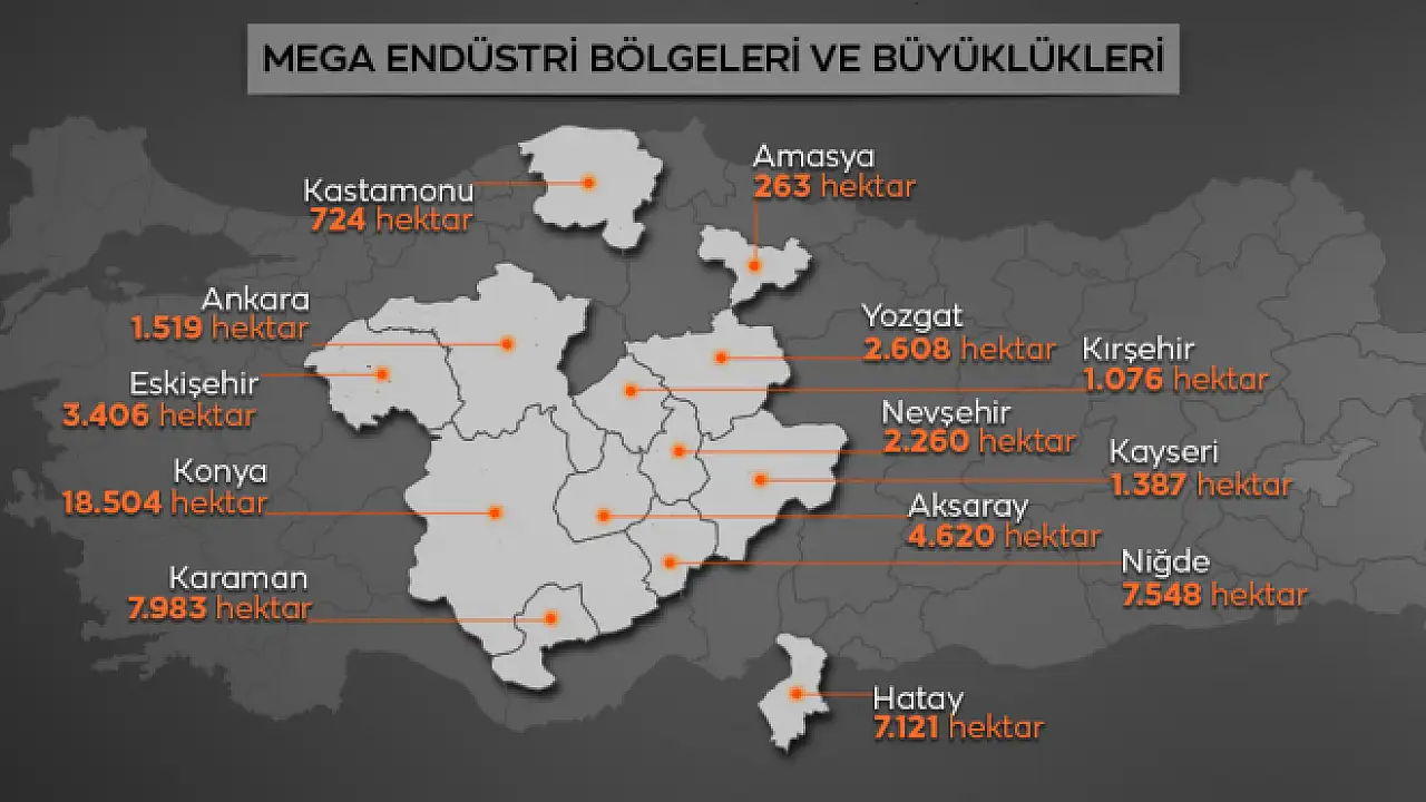 Diğer yandan söz konusu projenin Kayseri'de hangi bölgede hayata geçirileceği merak konusu oldu. İllere göre mega endüstri bölgeleri ve büyüklüklerine bakıldığında Kayseri'de proje 1387 hektarlık alanda hayata geçecek.