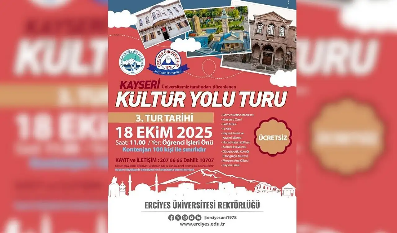 Kayseri Kültür Yolu Turu’nda öğrenciler Gevher Nesibe Medresesi, Kurşunlu Cami, Saat Kulesi, İç Kale, Kayseri Kalesi ve Kayseri Müzesi, Hunat Hatun Medresesi, Atatürk Evi Müzesi, Güpgüpoğlu Konağı, Meryem Ana Müzesi ve Kayseri Lisesi’ni ücretsiz bir şekilde gezme imkanı buluyor. 18 ve 25 Ekim tarihlerinde düzenlenecek olan turların saat 11.00’da Öğrenci İşleri önünde başlayacağı belirtildi.
