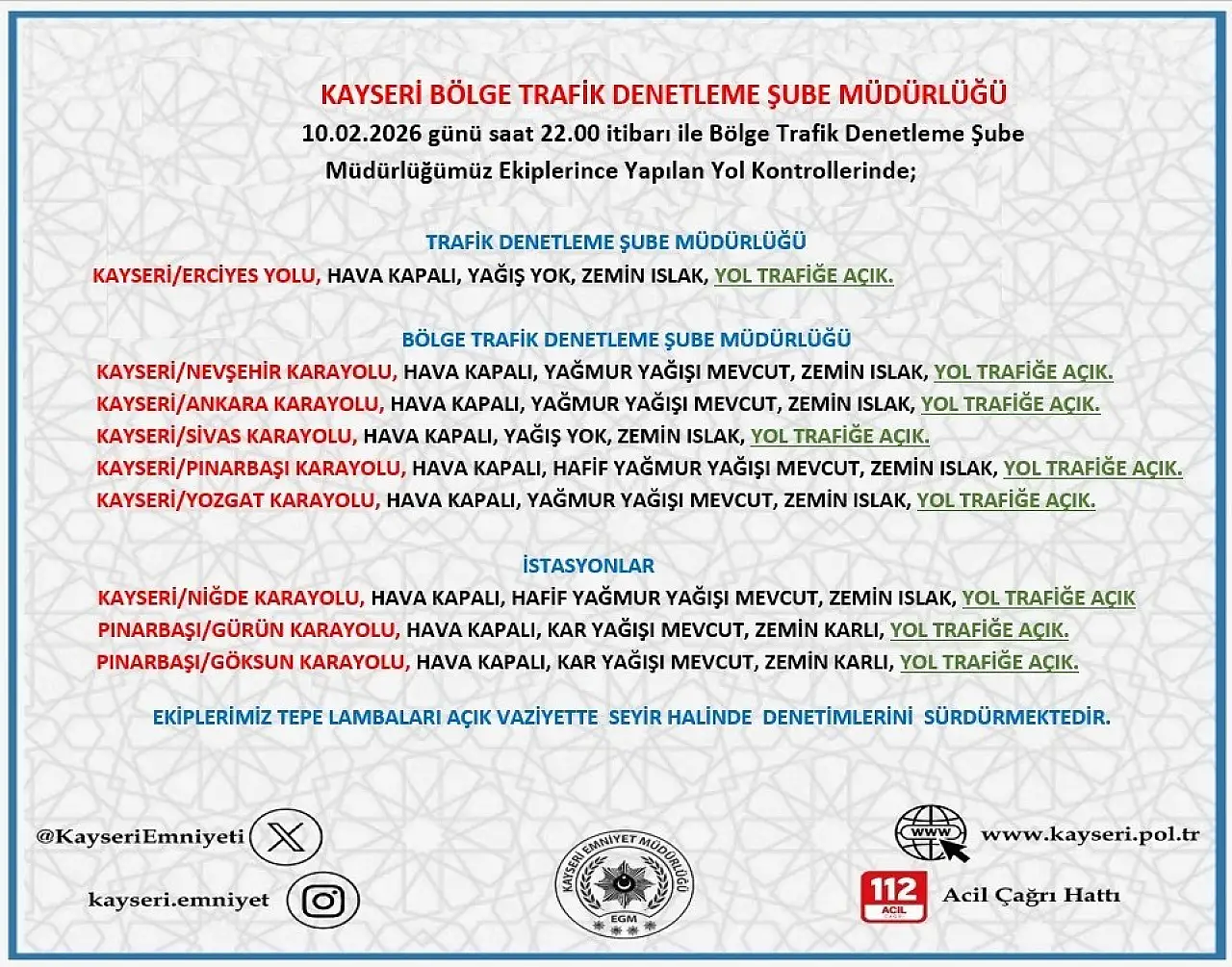 Kayseri Bölge Trafik Denetleme Şube Müdürlüğü, saat 22.00 itibarıyla şehirlerarası yollarda ulaşımın sorunsuz sürdüğünü, ancak Pınarbaşı hattında kar yağışının etkili olduğunu duyurdu.