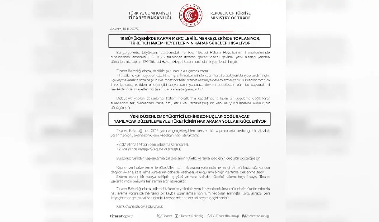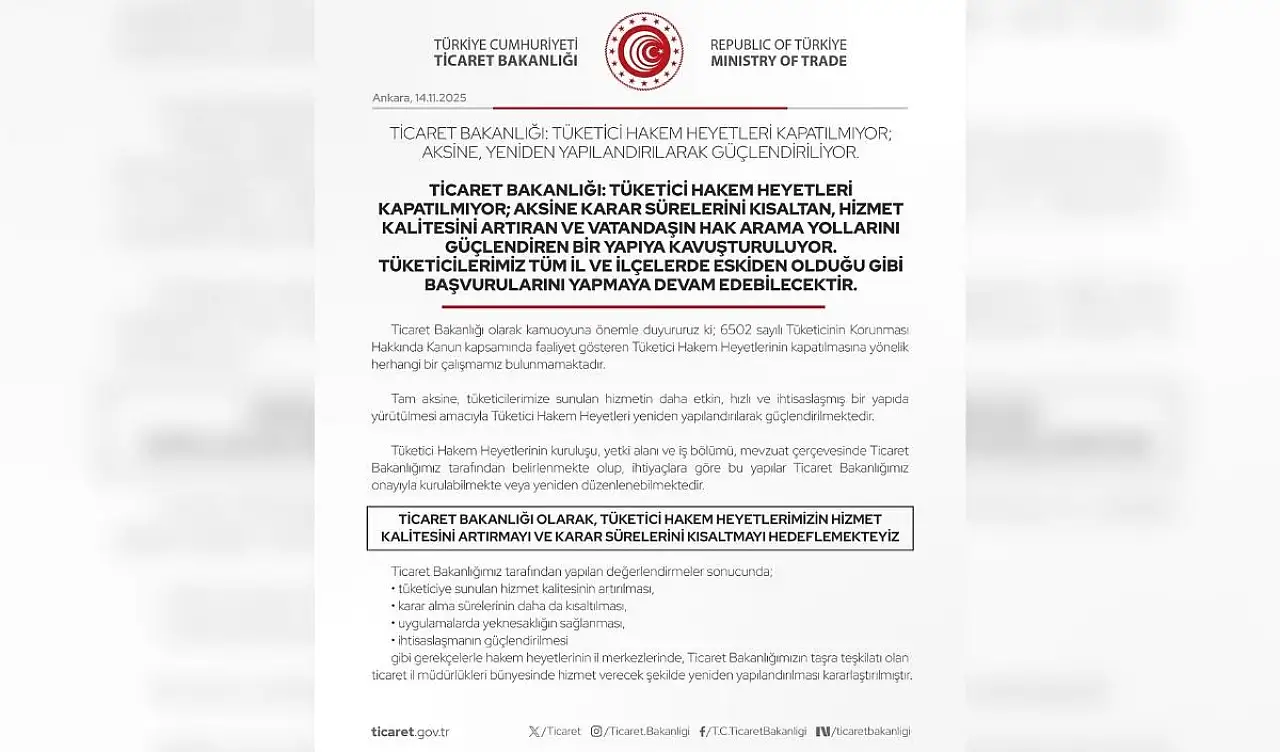 İddiaların asılsız olduğunu belirten Mahmut Gürcan, “Tüketici Hakem Heyetlerinin kapatıldığına dair dile getirilen asılsız iddialar gerçeği yansıtmamaktadır. Ticaret Bakanlığımızın açıkladığı üzere Tüketici Hakem Heyetleri kapatılmıyor; aksine vatandaşımızın başvuru süreçlerini hızlandıran ve hizmet kalitesini artıran bir yapıya kavuşturuluyor” dedi.