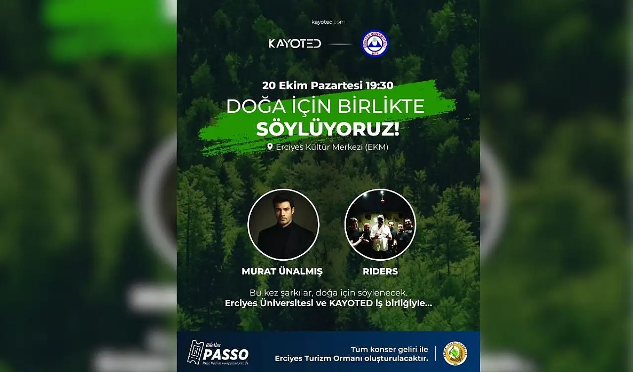 Erciyes Üniversitesi sosyal medya hesabından yaptığı paylaşımda, “Bu kez şarkılar, doğa için söylenecek! Erciyes Üniversitesi ve KAYOTED iş birliğiyle düzenlenen ‘Doğa İçin Birlikte Söylüyoruz!’ konserinde, Murat Ünalmış ve RIDERS sahne alıyor” ifadelerine yer verdi. 20 Ekim’de saat 19.30’da başlayacak olan etkinliğe girişin ücretli olduğu tüm geliri ile de ‘Erciyes Turizm Ormanı’ yapılacağı belirtildi.
