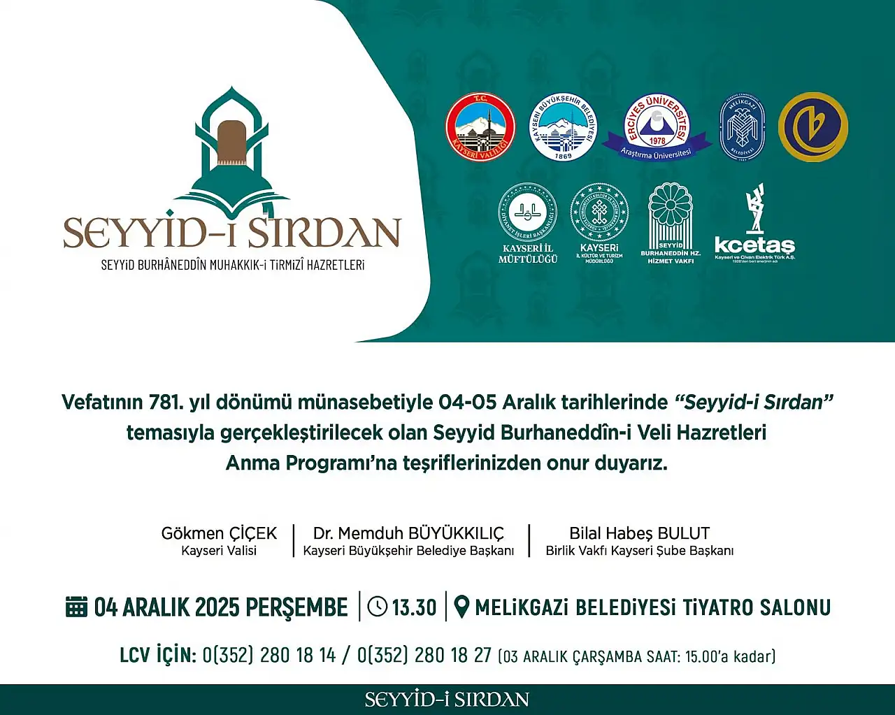 Kayseri Büyükşehir Belediyesi, Kayseri Valiliği ve Birlik Vakfı iş birliği ile Seyyid Burhaneddin'i vefatının 781. yıldönümünde anmaya hazırlanıyor. Kayseri'de düzenlenecek programın tarihleri belli olurken vatandaşlar da davet edildi.