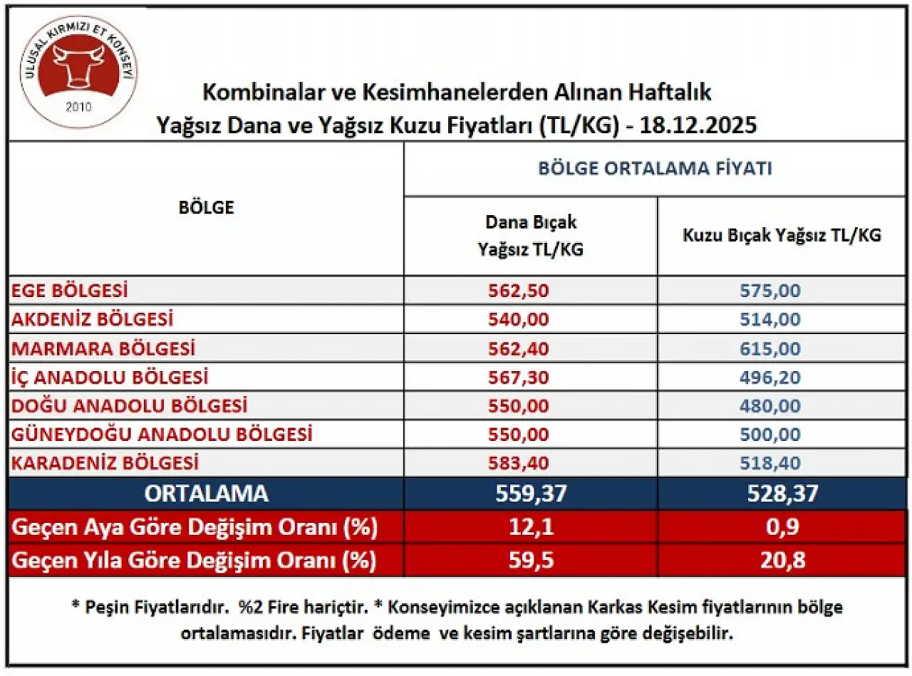 Ulusal Kırmızı Et Konseyi (UKON), haftalık kombine raporunu yayımlayarak kırmızı et piyasasındaki son durumu paylaştı. Rapora göre dana karkas kesim fiyatları yükseliş trendini korurken, kuzu eti fiyatlarındaki durağan yapı dikkat çekiyor.