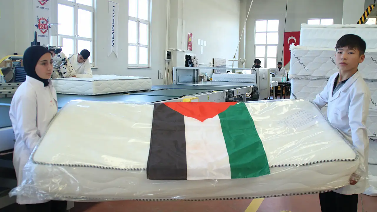 Kayseri'de Türkiye Tekstil Sanayi İşverenler Sendikası Mesleki ve Teknik Anadolu Lisesi öğrencileri, Filistin'e üretimini yaptıkları yataktan gönderecek.