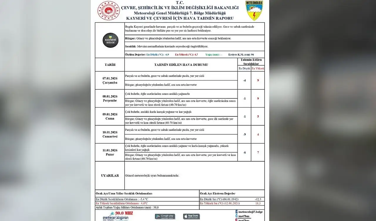 Kayseri’de yarın parçalı ve az bulutlu, gece saatlerinde pus ve yer yer sisin hakim olması beklenirken, hava sıcaklığının en düşük -4 en yüksek 9 derece olacağı tahmin ediliyor. Perşembe günü ise yağmur yağabileceği, öğle saatlerinden sonra ise yer yer kuvvetli ve kısa süreli fırtınanın olabileceği öngörüldü.