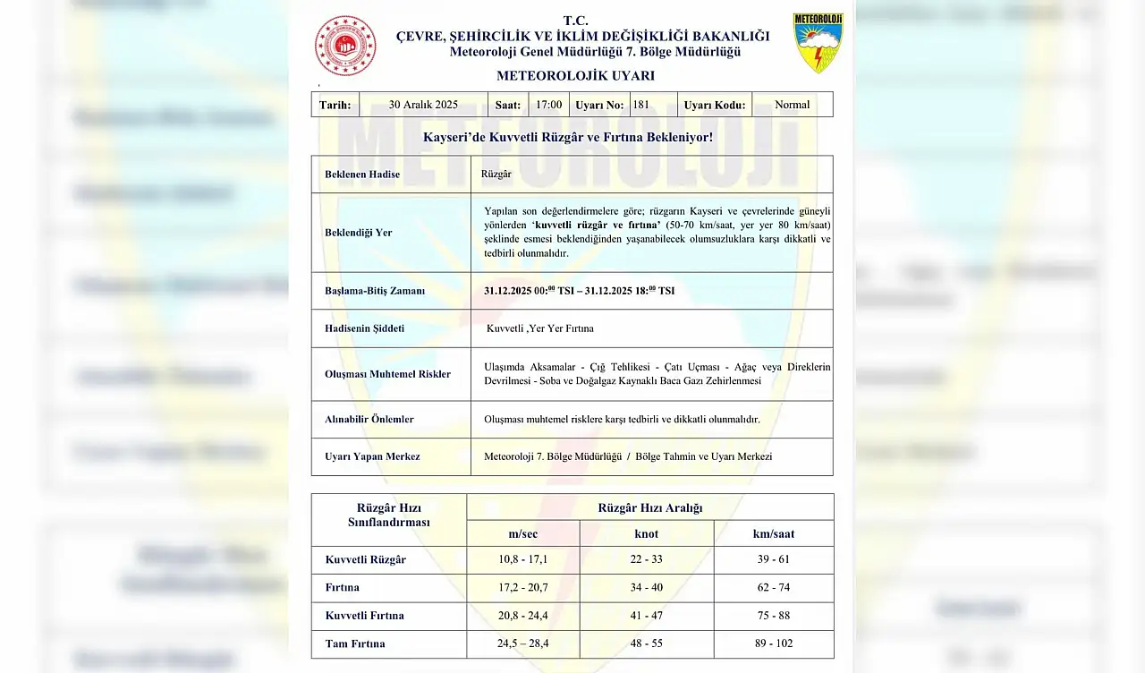 Meteoroloji 7. Bölge Müdürlüğü, 31 Aralık 2025 günü için Kayseri ve çevresine 'kuvvetli rüzgâr ve fırtına' uyarısı yaptı.