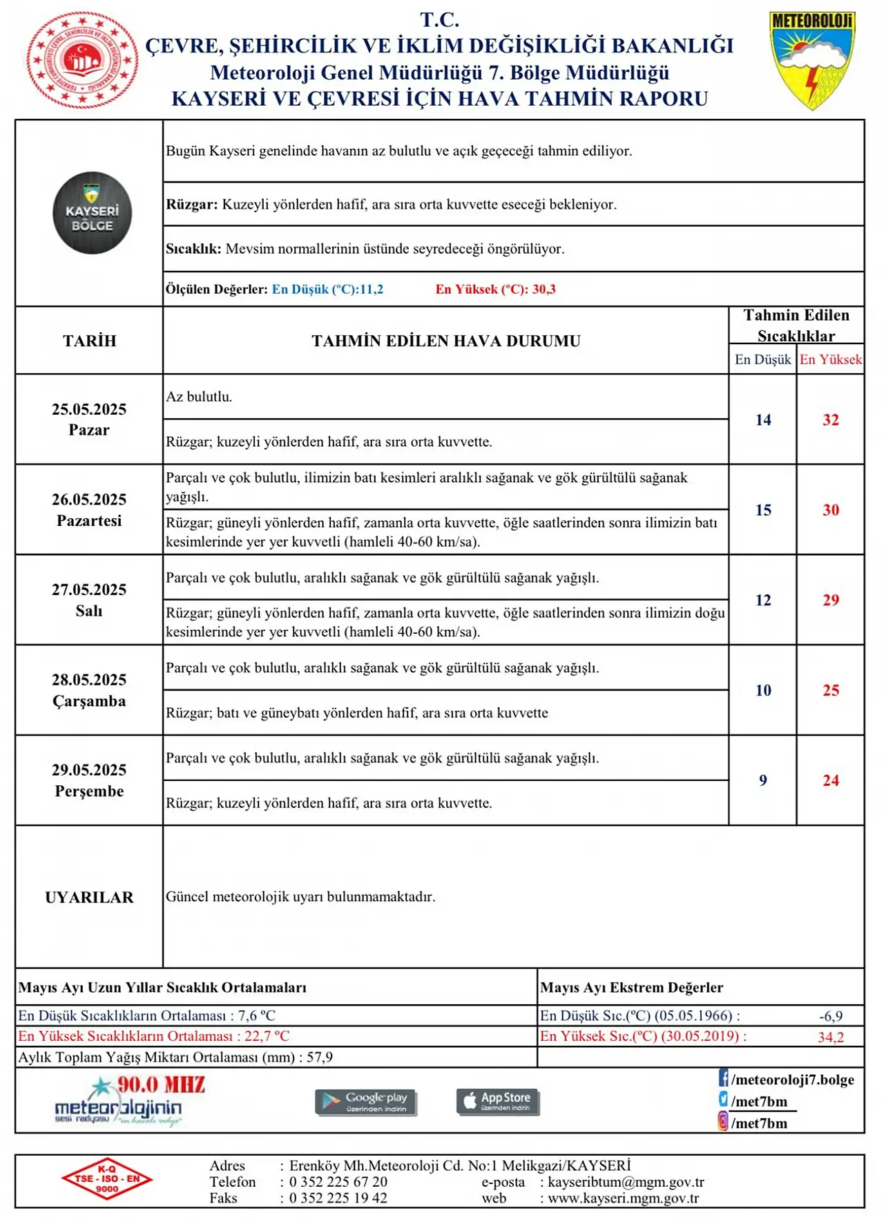 Meteoroloji 7. Bölge Müdürlüğü tarafından Kayseri’nin 5 günlük hava tahmin raporu yayımlandı. Rapora göre kentte parçalı ve az bulutlu hava yerini sağanak yağışa bırakacak.