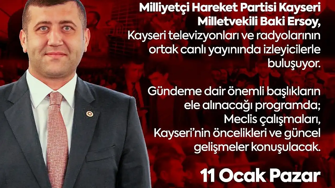 Milliyetçi Hareket Partisi Kayseri Milletvekili Baki Ersoy, yarın (11 Ocak Pazar) Kayseri'de faaliyet gösteren televizyon ve radyoların ortak yayınında soruları yanıtlayacak. Ayrıntılar Kayseri Olay haberde…