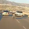 Görüntülerde, motosiklet sürücüsünün uzun süre bu şekilde yoluna devam ettiği, sonra gözden kaybolduğu görüldü.