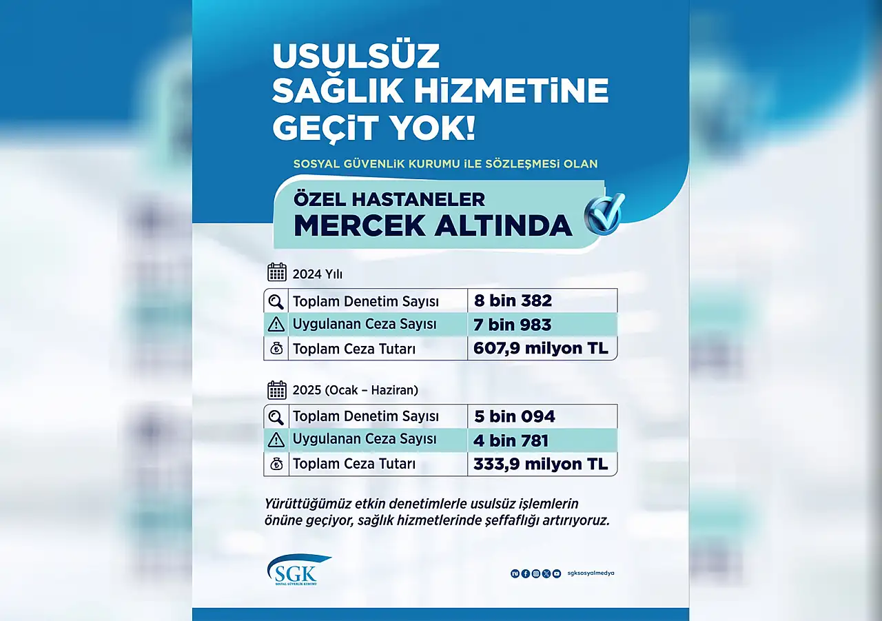 Çalışma ve Sosyal Güvenlik Bakanlığı bünyesinde faaliyet gösteren Sosyal Güvenlik Kurumu (SGK), yılın ilk yarısında özel hastanelere yönelik 5 bin 94 denetim gerçekleştirildiğini, usulsüz olduğu tespit edilen işlemler nedeniyle de özel hastanelere 333,9 milyon lira ceza uygulandığını açıkladı.