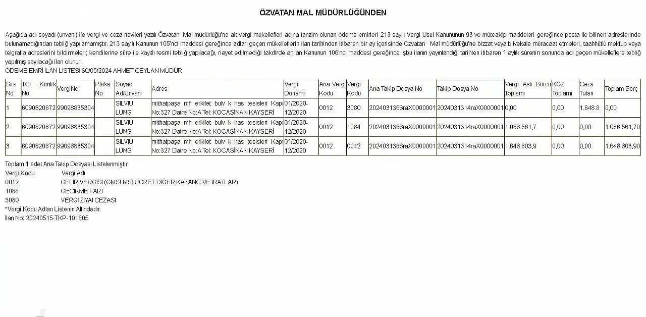 36 yaşındaki Romanyalı file bekçisi Lung hakkında vergi borcu nedeniyle Mal Müdürlüğü tarafından verilen ilanda şu ifadeler yer almıştı: Özvatan Mal Müdürlüğü'ne ait vergi mükellefleri adına tanzim olunan ödeme emirleri 213 sayılı Vergi Usul Kanununun 93 ve müteakip maddeleri gereğince posta ile bilinen adreslerinde bulunamadığından tebliğ yapılamamıştır. 213 sayılı Kanunun 105'nci maddesi gereğince adları geçen mükelleflerin ilan tarihinden itibaren bir ay içerisinde Özvatan Mal Müdürlüğü'ne bizzat veya bilvekale müracaat etmeleri, taahhütlü mektup veya telgrafla adreslerini bildirmeleri; kendilerine süre ile kayıtlı resmi tebliğ yapılacağı, riayet edilmediği takdirde anılan Kanunun 106'ncı maddesi gereğince işbu ilanın yayınlandığı tarihten itibaren 1 aylık sürenin sonunda adı geçen mükelleflere tebliğ yapılmış sayılacağı ilan olunur.