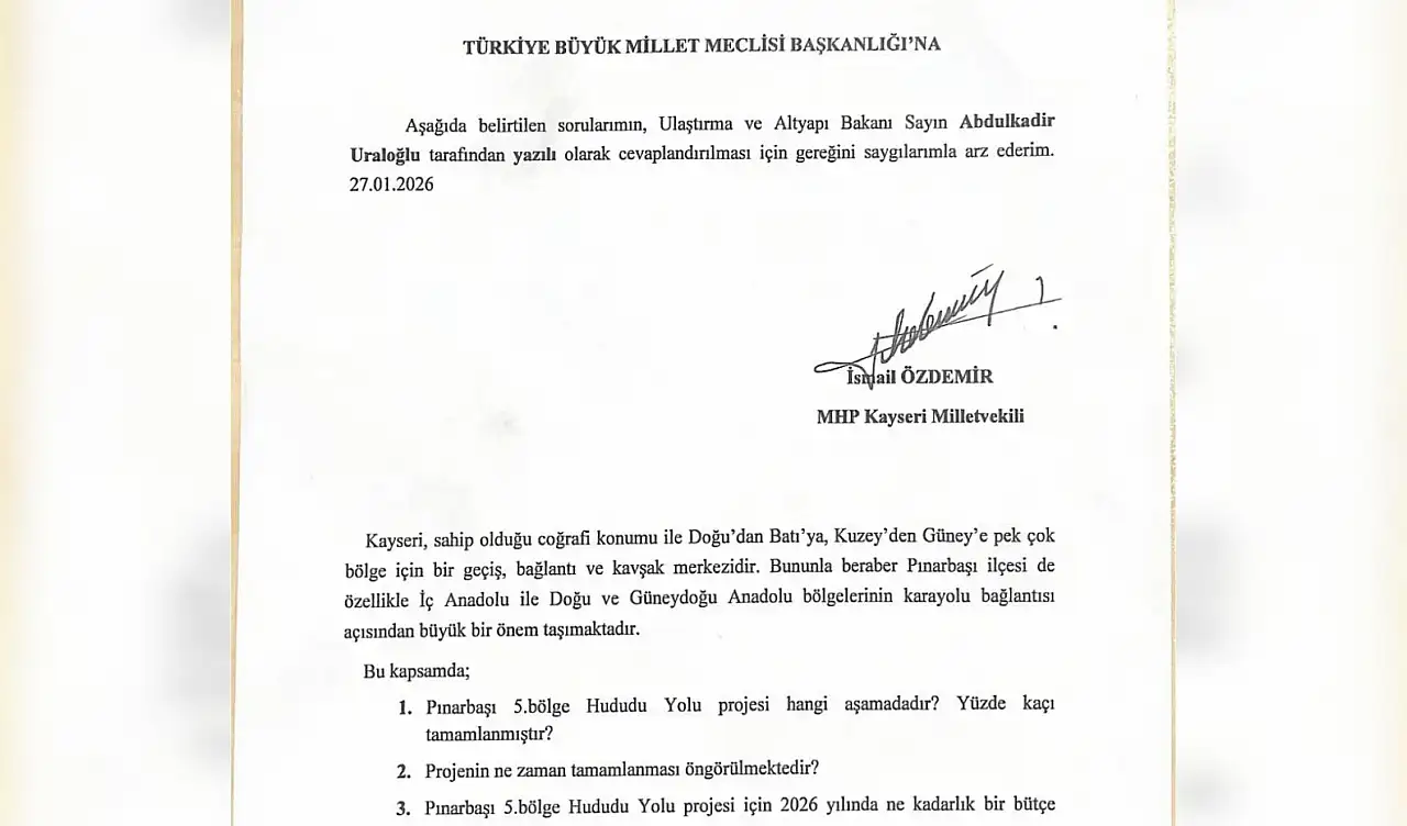 MHP Kayseri Milletvekili İsmail Özdemir, Kayseri'nin stratejik ulaşım noktalarından biri olan Pınarbaşı 5. Bölge Hududu Yolu projesindeki son durumu Ulaştırma ve Altyapı Bakanı Abdulkadir Uraloğlu'na sordu.
