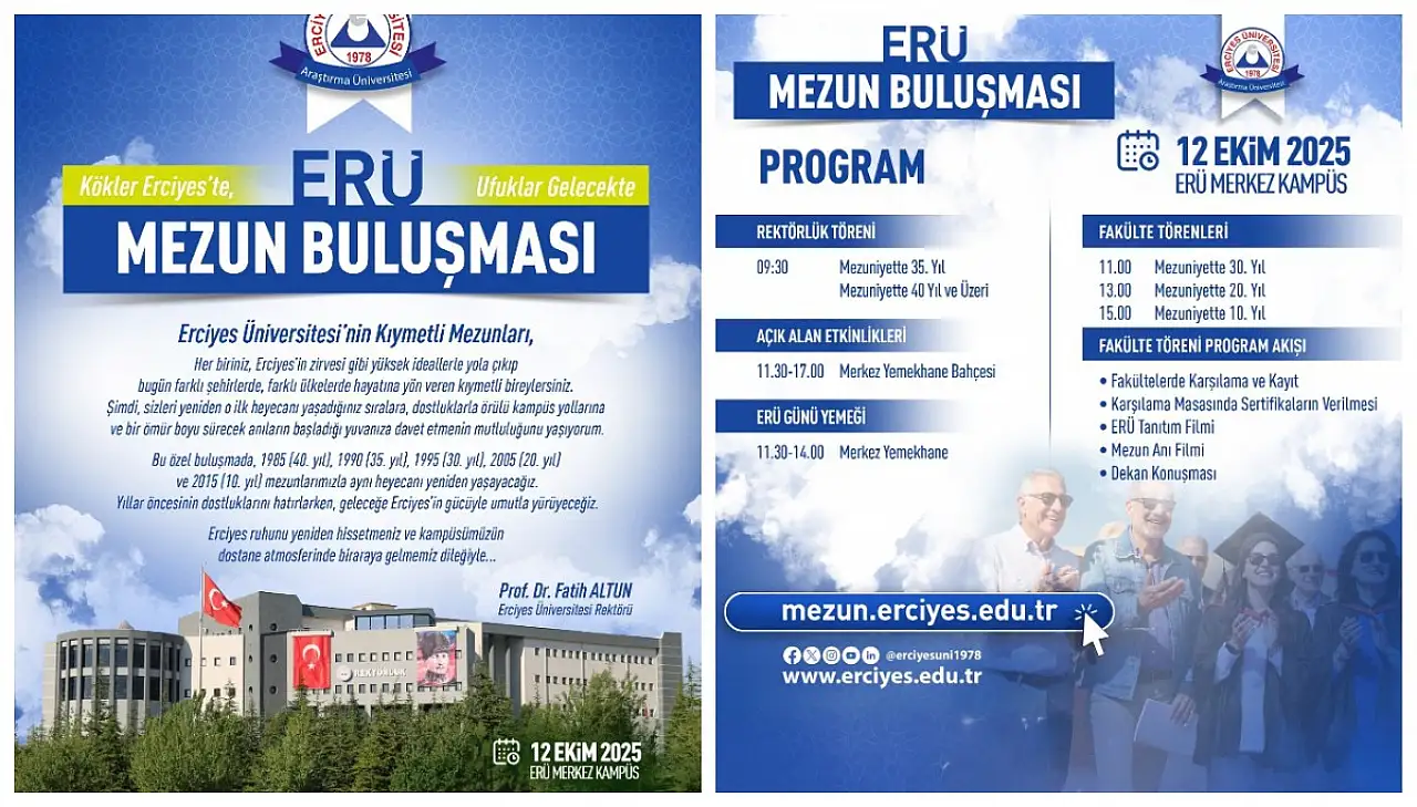 Mezunlar programına katılmak için bir süre önce hazırlanan formun 15 Eylül 2025 tarihine kadar doldurulması gerekiyordu. ERÜ'den ‘12 Ekim’de düzenlenecek Erciyes Üniversitesi Mezunlar Günü için sabırsızlanıyoruz. Yıllar sonra yeniden Erciyes çatısı altında buluşmak, bizim için büyük bir mutluluk olacak.’ açıklaması da yapıldı. Diğer yandan mezunların bu özel günü keyifle geçirebilmesi ve otopark sorunu yaşamamaları için de önlemler alındı. Buna göre Mühendislik, İİBF, Tıp Fakültesi otoparkları ve otellerden Erciyes Kültür Merkezi’ne ücretsiz ring seferleri düzenlenecek. ERÜ yönetimi ‘Otopark düşünmeden, eski dostlarla yeniden bir araya gelmenin keyfini yaşayın’ mesajı da paylaştı.