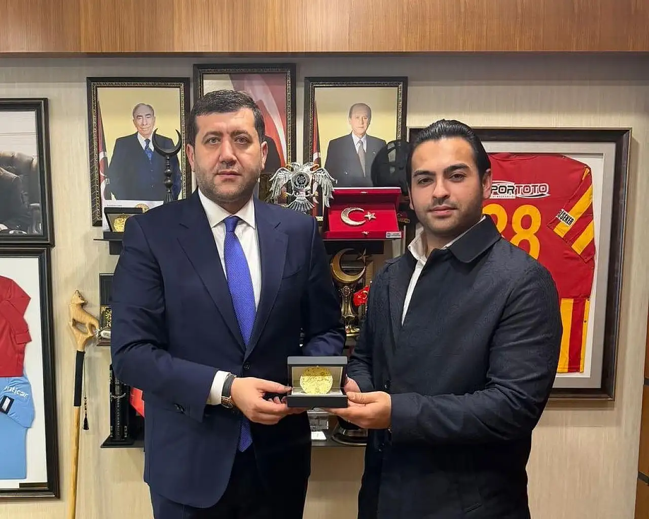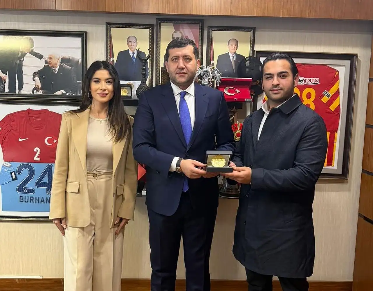 Öte yandan hazırlanan madalyonlar Milletvekili Ersoy’a teslim edildi. Ersoy, “Amore Kuyumculuk sahibi değerli kardeşim Batuhan Metin ve kıymetli eşi Suhan Metin, tasarımını ve üretimini gerçekleştirdikleri; 2026 yılına özel, 38 adet olarak hazırlattığımız, Türk dünyası ve Kayseri’mize ait değerlerin motiflerini taşıyan madalyonları teslim etmek üzere ziyaretime geldiler. Nazik ziyaretleri ve kıymetli emekleri için kendilerine teşekkür ediyor, çalışmalarında başarılar diliyorum.” dedi.
