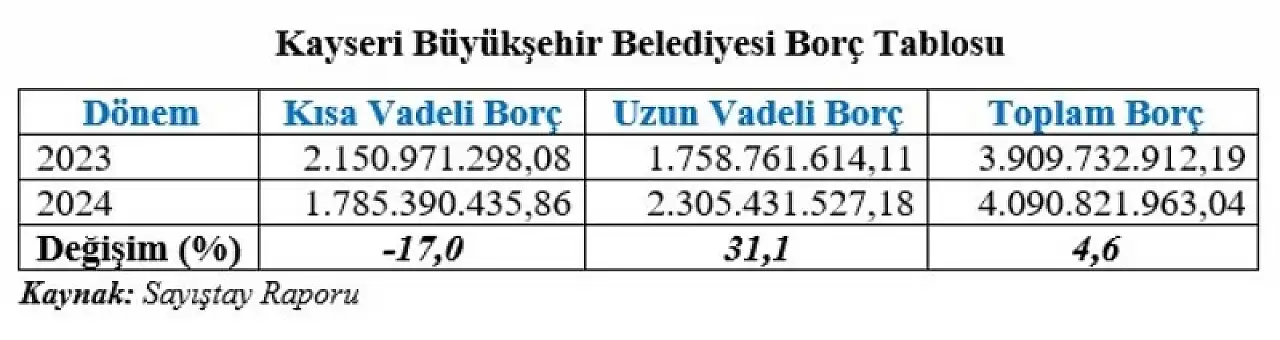 Sayıştay'ın Büyükşehir Belediyeler ve Bağlı İdareler ait 2024 denetim raporunda Kayseri Büyükşehir Belediyesi’nin kısa vadeli yabancı kaynakları 1 milyar 785 milyon 390 bin 435 lira 86 kuruş, uzun vadeli yabancı kaynakları 2 milyar 305 milyon 431 bin 527 lira 18 kuruş açıklanmıştı. Bu rakamlara göre Belediyenin borcu toplam 4 milyar 90 milyon 821 bin 963 lira 4 kuruş oluğu ortaya çıktı.