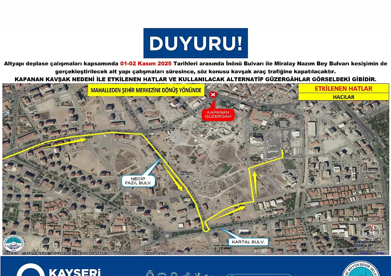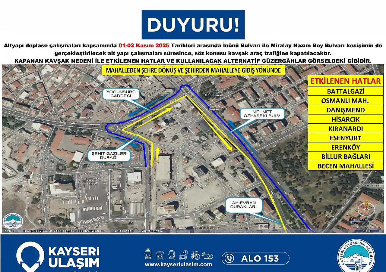 Büyükşehir Belediyesi ekipleri tarafından gerçekleştirilecek altyapı deplase çalışmaları kapsamında, 01-02 Kasım 2025 tarihlerinde İnönü Bulvarı ile Miralay Nazım Bey Bulvarı’nın kesişiminde bulunan kavşak araç trafiğine kapatılacak.